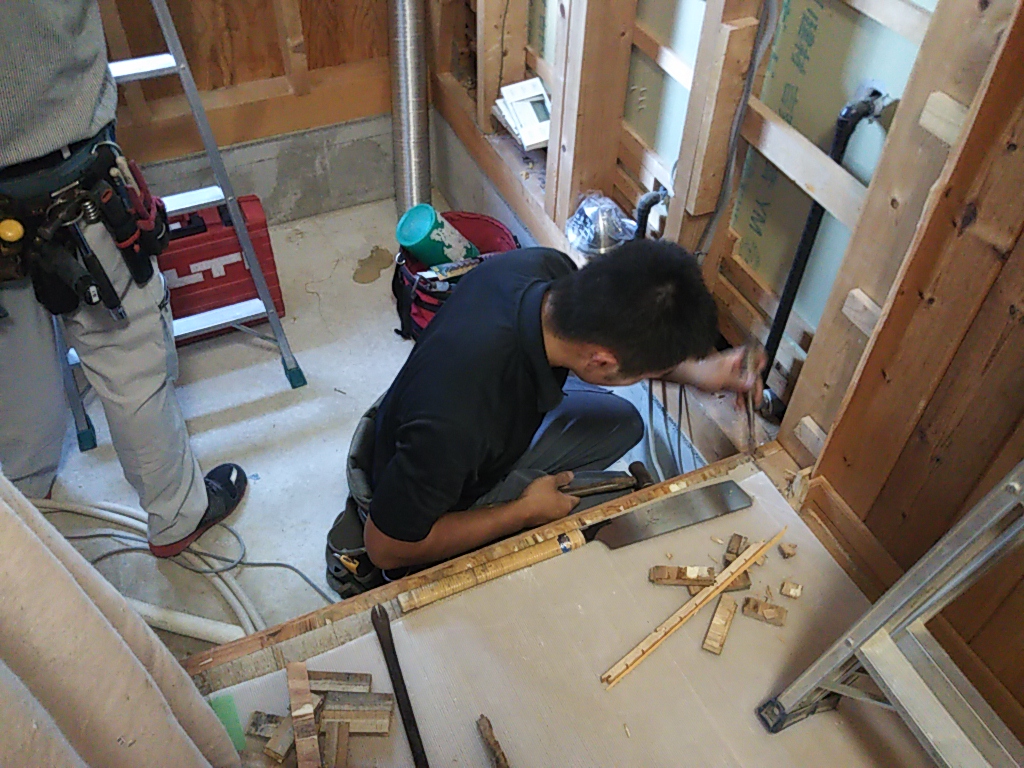 ユニットの解体が完了しました。すっかり空いたスペースで、新たなユニットの収まりに合うように、ほんの少しだけ電気配線、給排水配管、造作工事を施します。