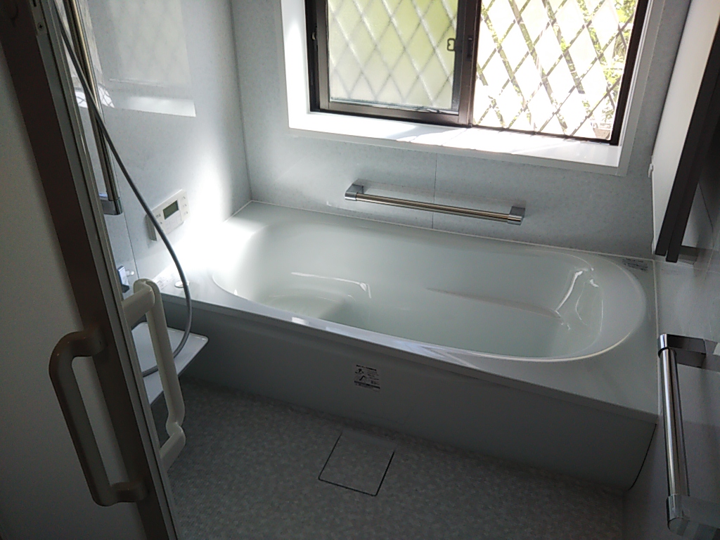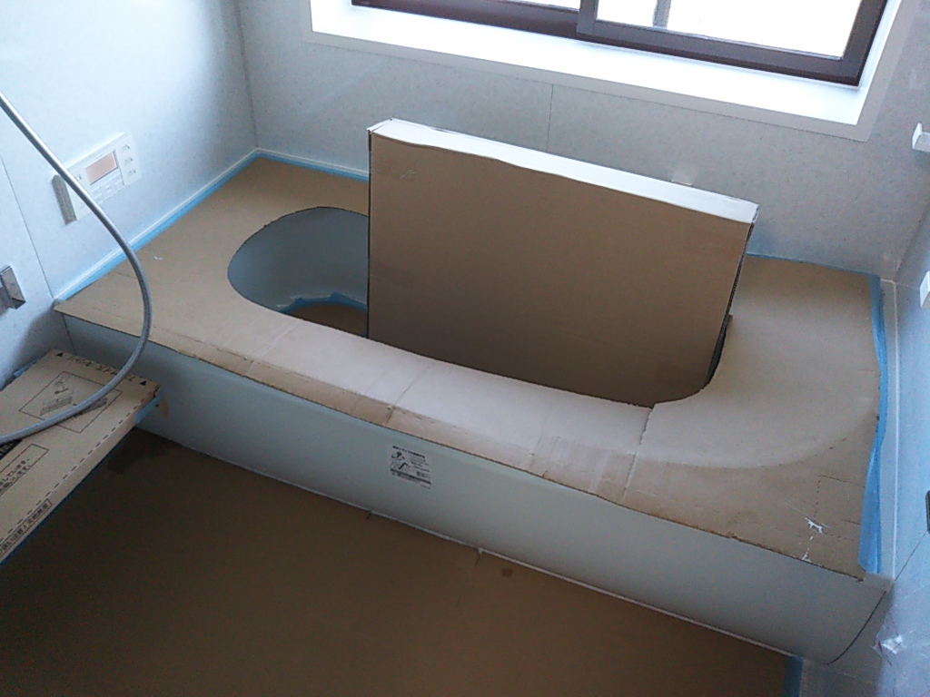 新しいユニットバスの取付工事を行いました。元々据え付けられていたユニットバスと同じメーカーの物ですが、この20数年で改良が重ねられ、性能は格段に上がっています。出入口の寸法も微妙に違うため、大工さんに入ってもらい造作枠工事を行います。