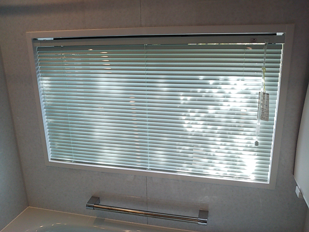 浴室窓前にアルミブラインドを取付けにうかがいました。サッシのガラスは型板ガラス(模様が入って向こうが見えづらいガラス)とはいえ浴室なので内側にブラインドを取付けました。通常は金物をビスで固定してから取付けますが、浴室に穴を開けるわけにはいかないので、専用の両面テープ付きの受金物を貼り付けてから本体をセットしています。