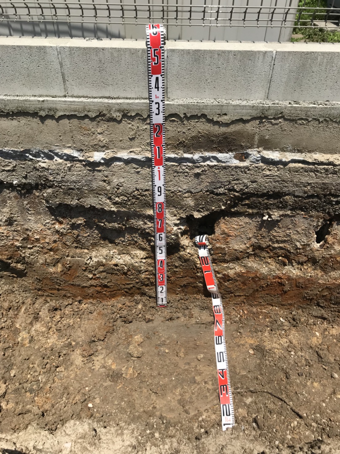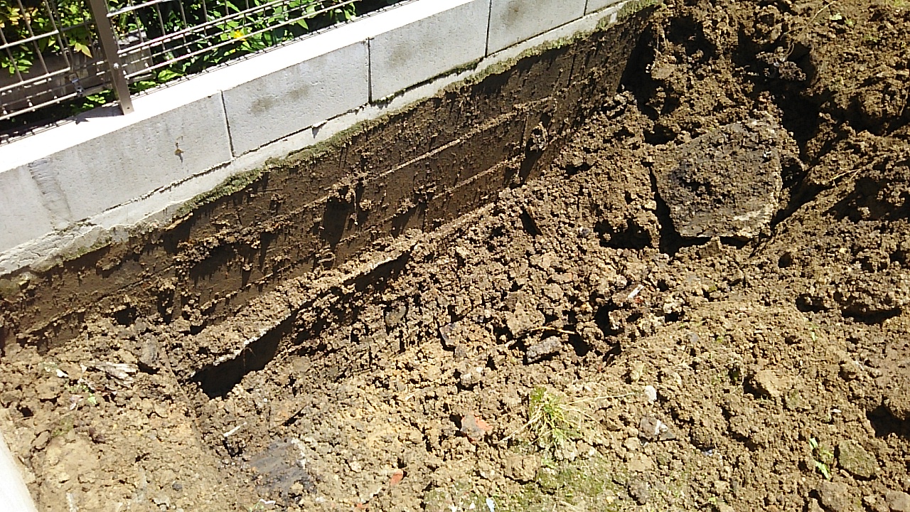 深さ約1.5mまで掘り下げ、昔の擁壁の足元が見えてきました。底辺を整地して新たな下地を組む場所をつくります。