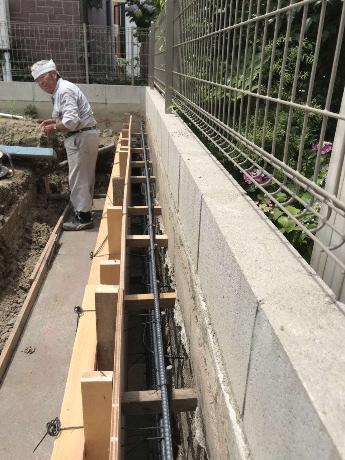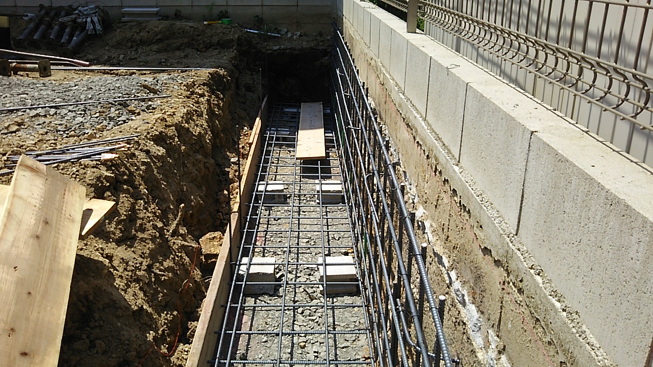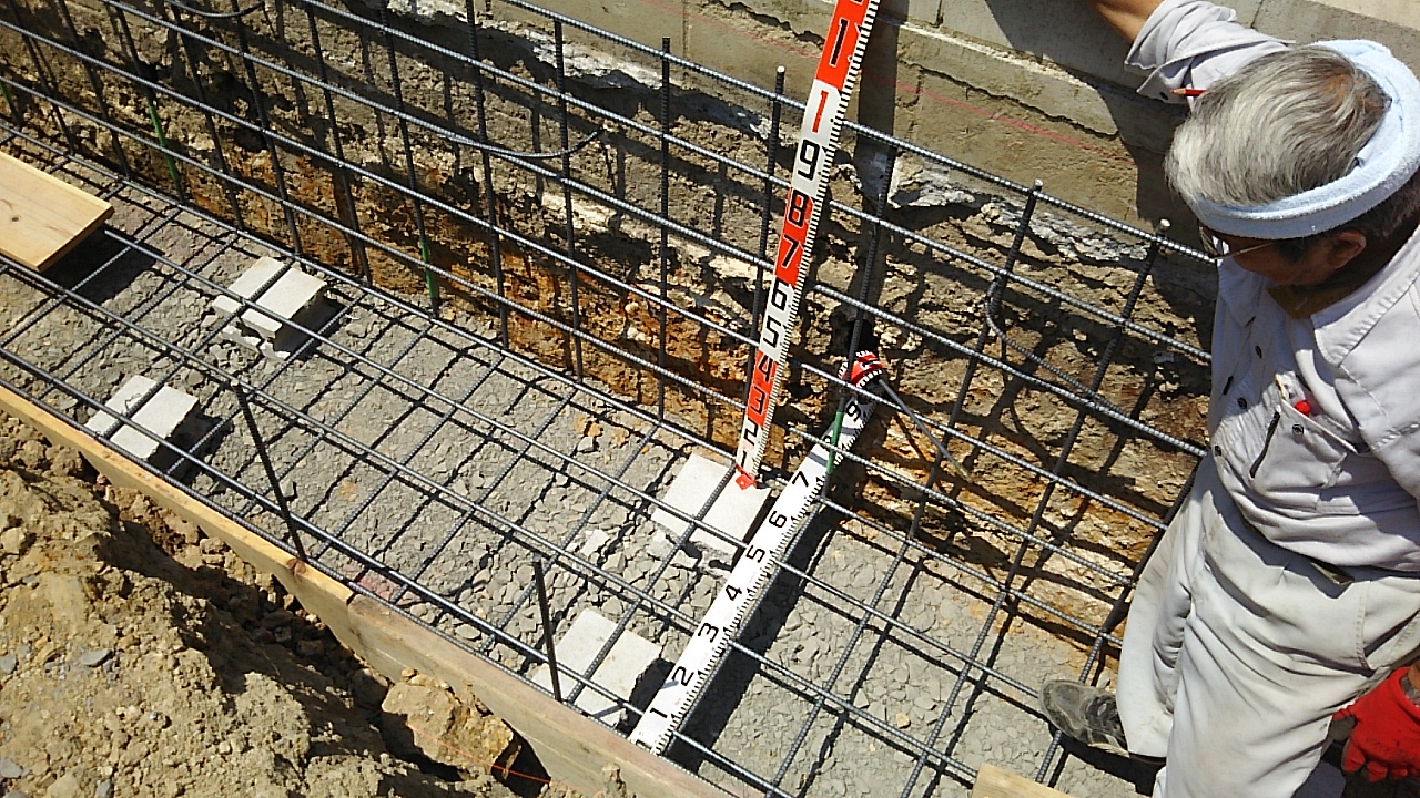 擁壁のための配筋工事。所定のピッチに配筋されているか、定規をあてて確認しています。梅雨前とはいえかなりの暑さのこの現場、そろそろ熱中症の魔の手からの対策を練らなければいけない時期です。