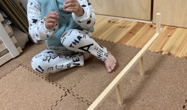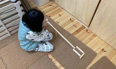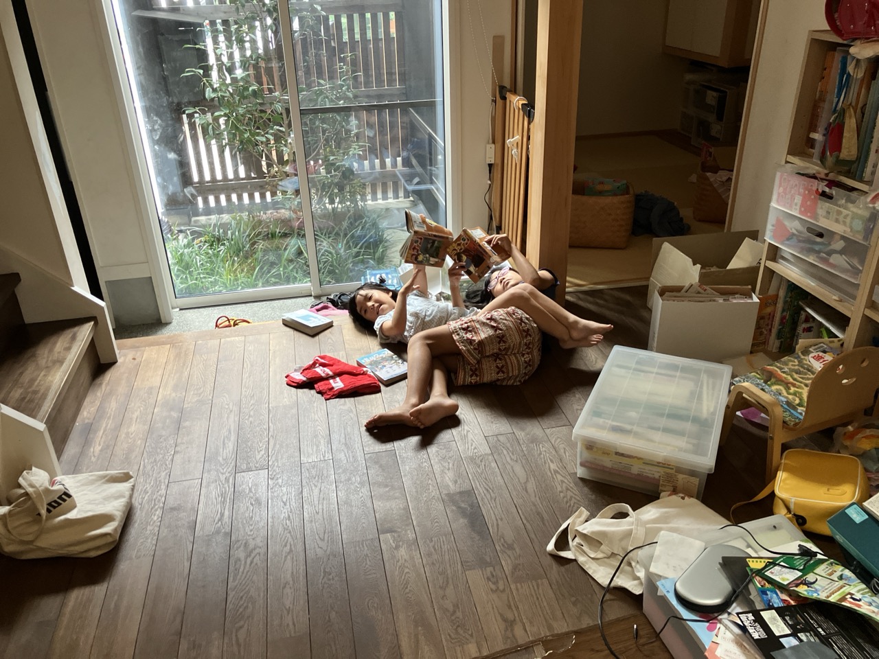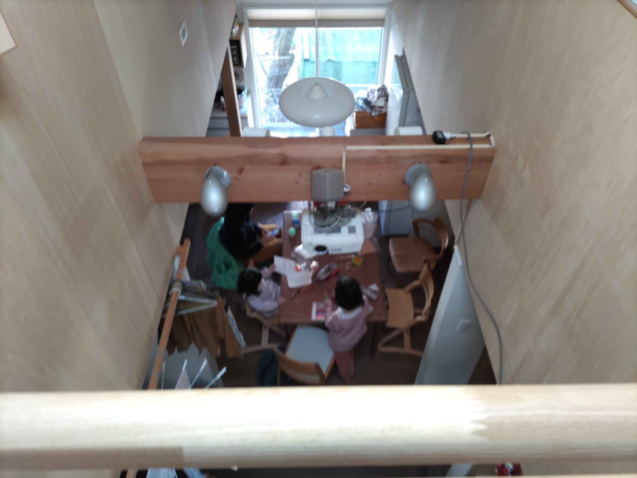 手摺越しにのぞむ一家団欒の場。長女sumiちゃんはもう大きくなり(重心位置が高くなり)手摺によって落下防止になります。utaちゃんがさらに大きく、中学生くらいになって危険を察知するようになればこの手摺も不要になってくるでしょう。