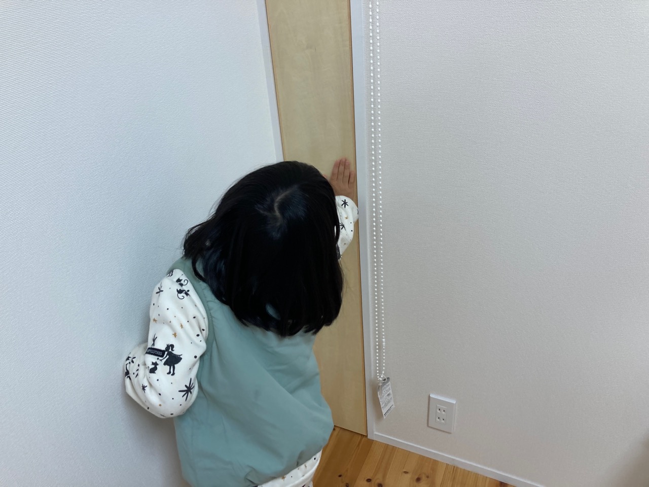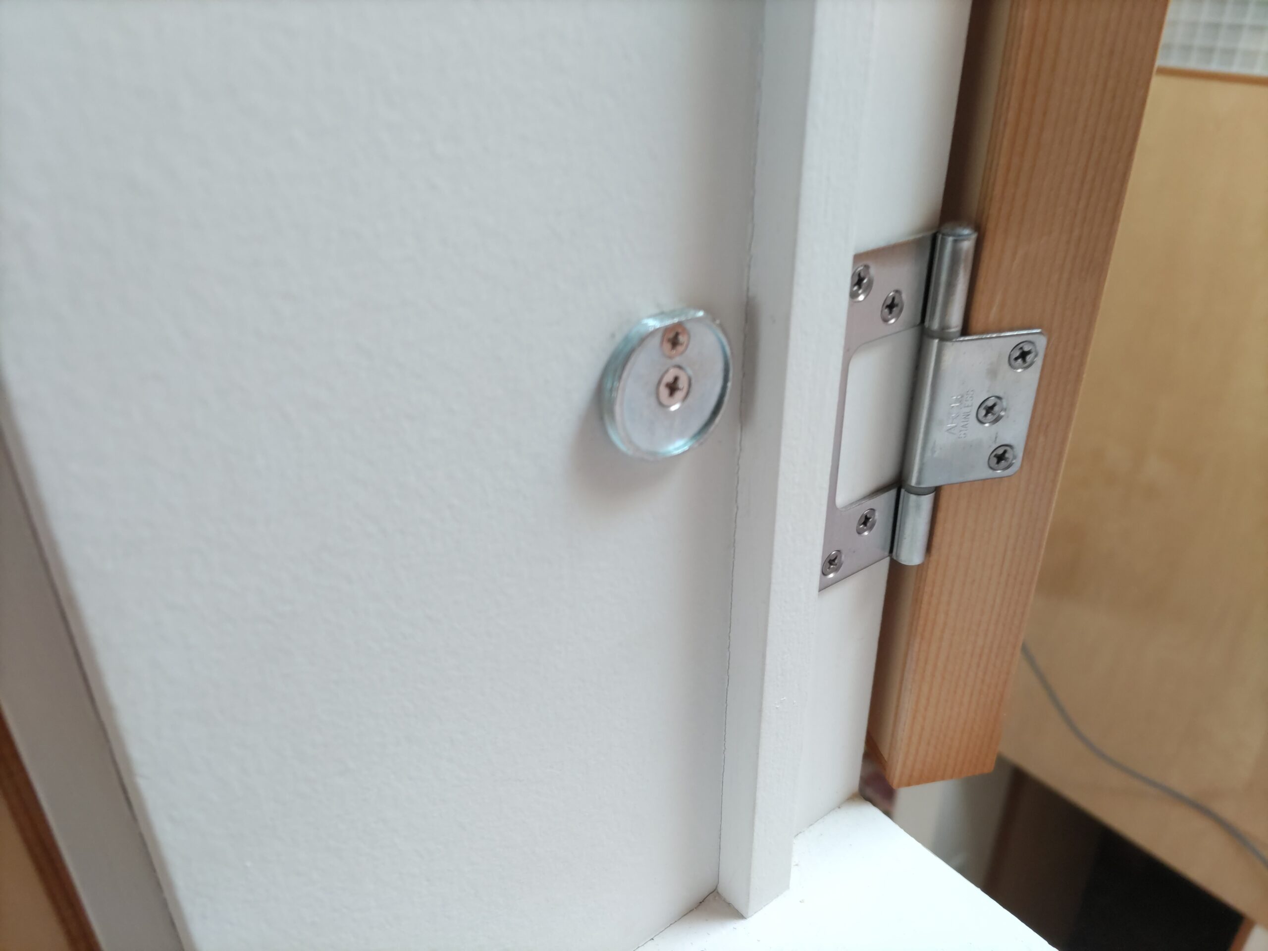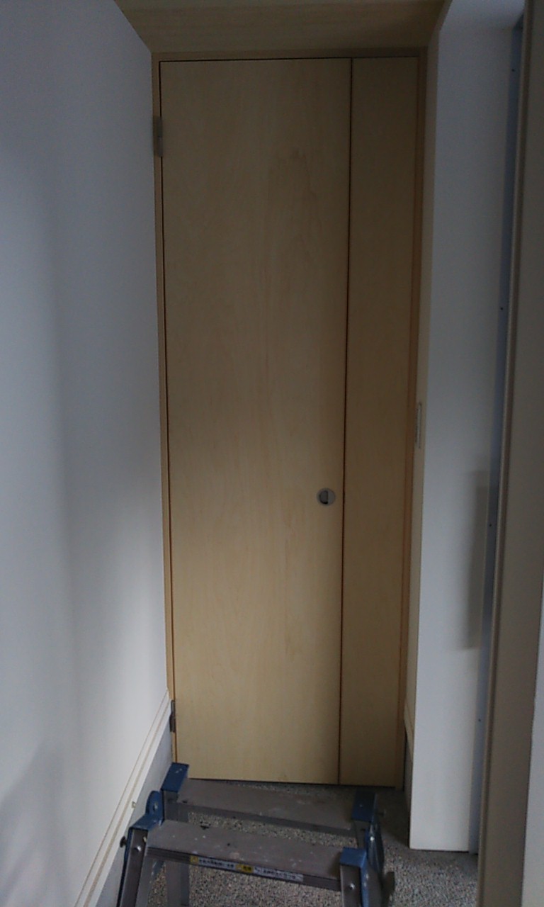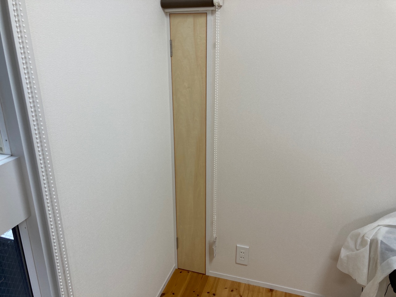 道路向いにある外灯からの光が気になり、ロールスクリーンだけでは漏れてくるので今回の建具の取付を計画しました。開閉はプッシュキャッチ金具によるので表面には取っ手などは付かずすっきりとした収まりとなります。