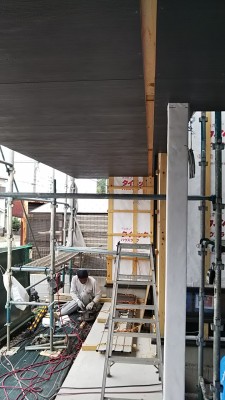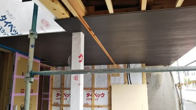 外装工事は屋根と外壁に続いて軒天井を施工。下地の段階では防水シートや下地木材など明るい色の材料であったのに対し、外装材はシックなダークブラウンでまとめられています。
