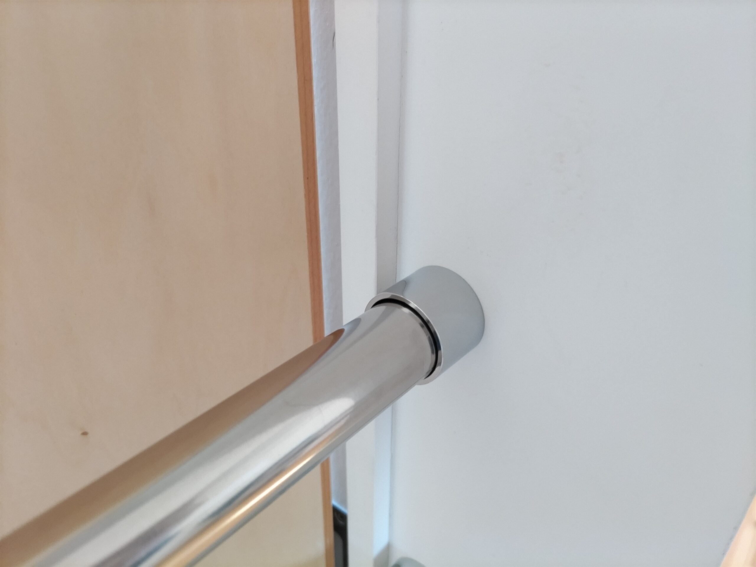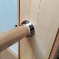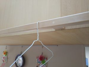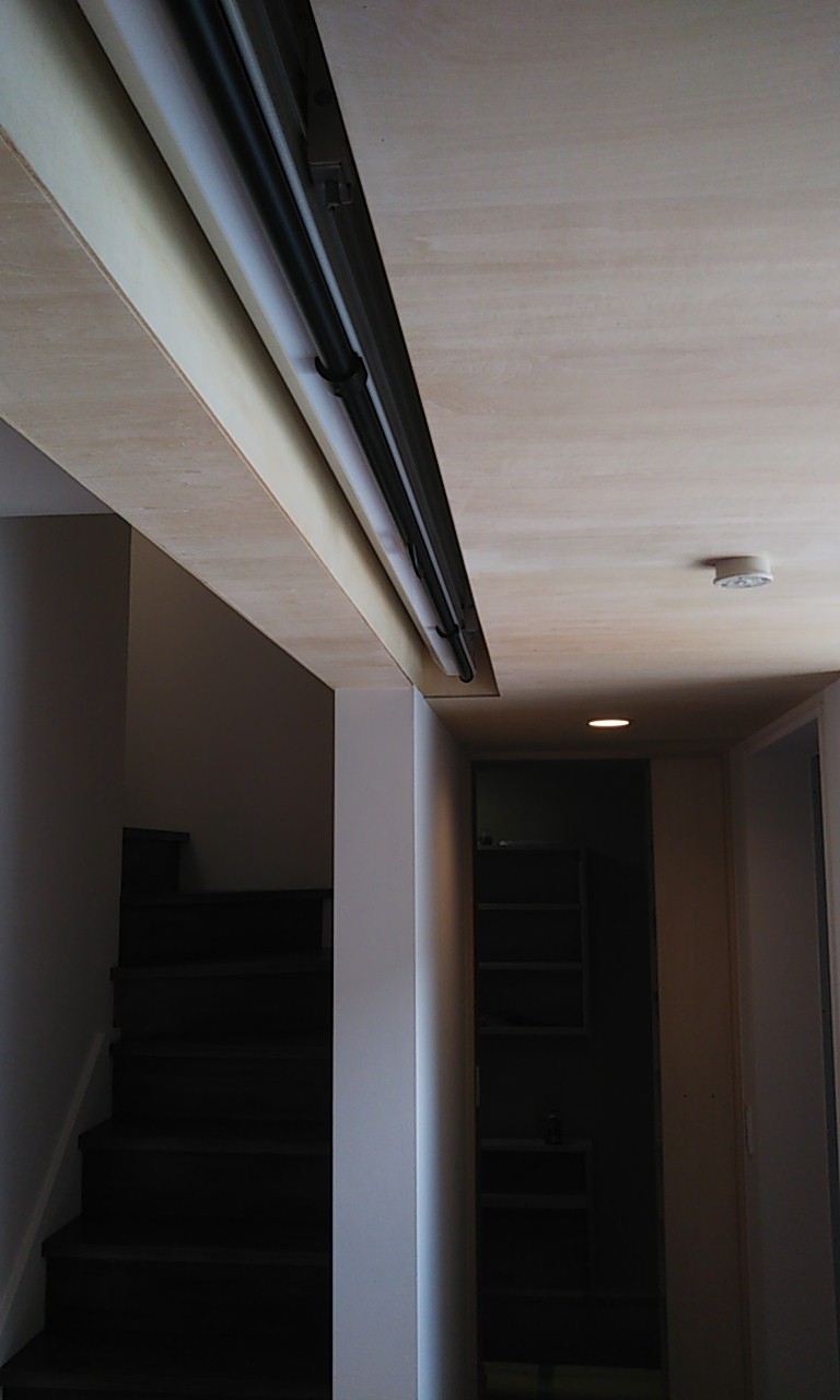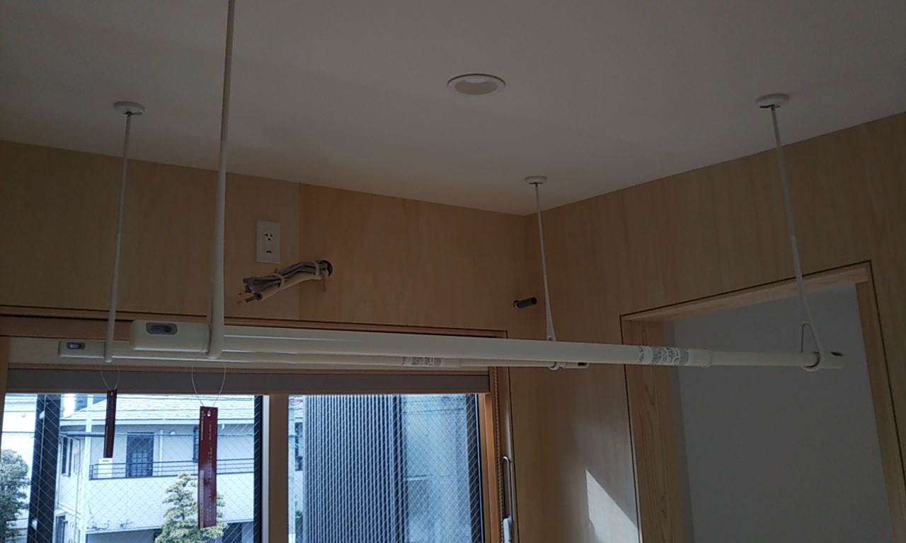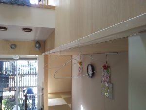 リビングの壁の一面に、洗濯室から洗いあがってきた洗濯物を一時的にかけておく物干が取り付けたい。ただしステンレスのパイプなどで質感的に目立つものでなく、空間にマッチしたものを。 というk様のリクエストから、桧の角材を面取りして三尺おきに台座を付けて取付けてみました。背面のシナベニヤと色的にマッチしており、あまり悪目立ちせずに取付けられたのではないでしょうか。