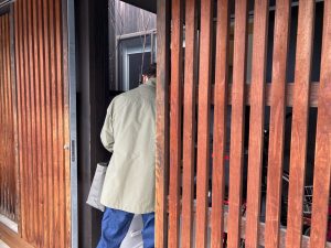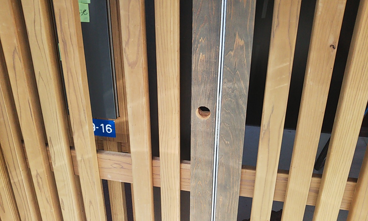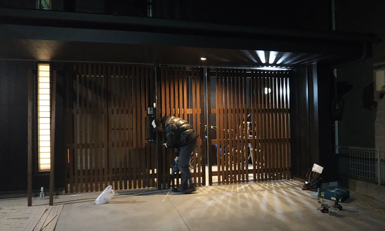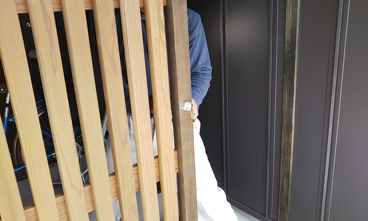 ゲートの錠取付工事。内装建具の職人さんに依頼していますが、慣れない外部の鉄骨と木材の部分に四苦八苦しながら取り付けています。