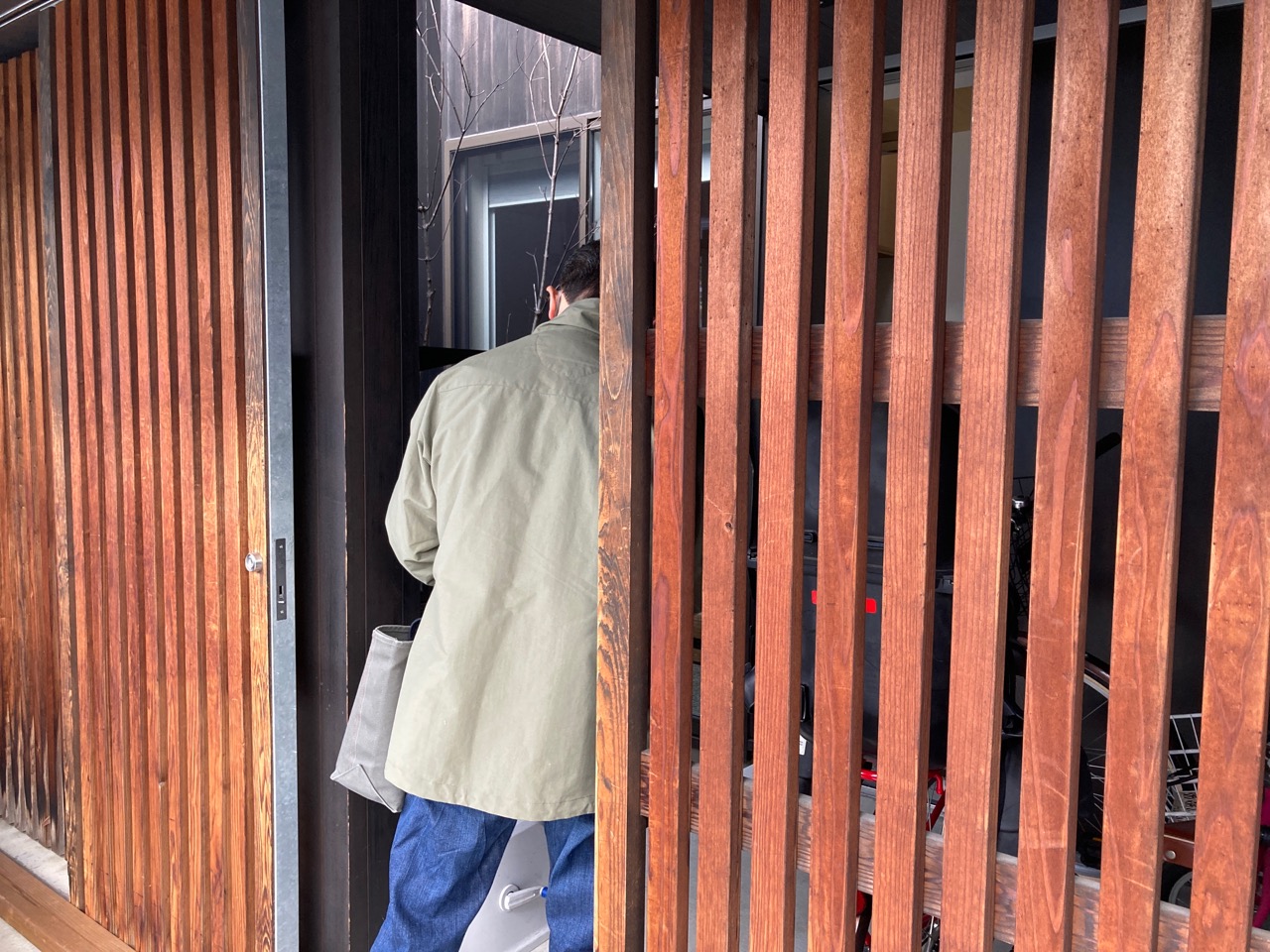 いよいよファサードの印象を決定づける格子ゲートの取付工事開始。縦桟のピッチなど入念に検討を重ねてきました。
