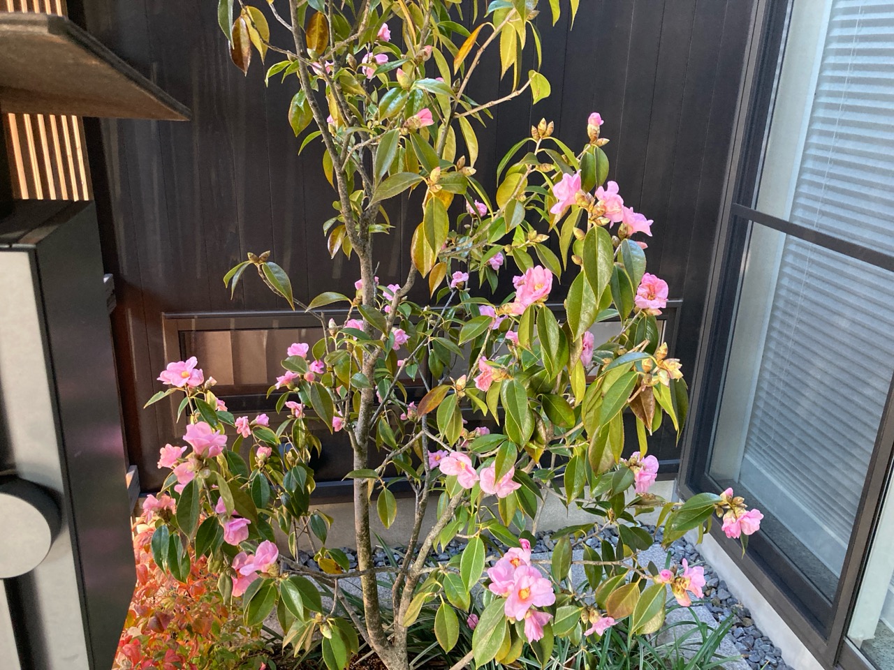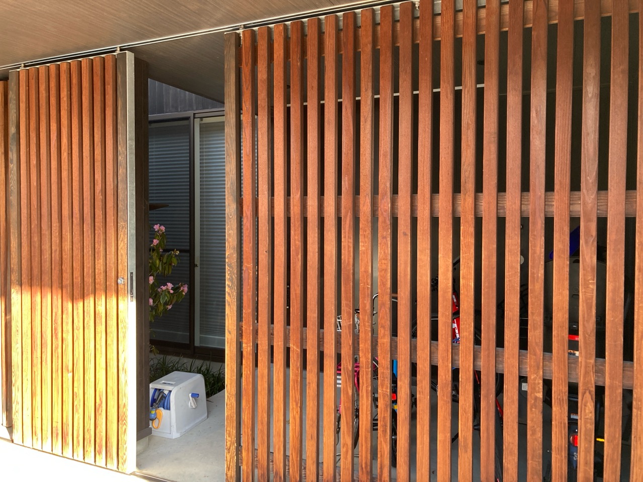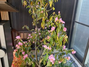 年末の点検に引き続き5年目の点検にうかがいました。年末にも多少うかがっているので今回の点検はスムーズです。門扉の格子に使用されているエステックウッドも日にさらされて少し風合いが出てきました。坪庭に植えられた植栽にもこの時期花が咲いています。