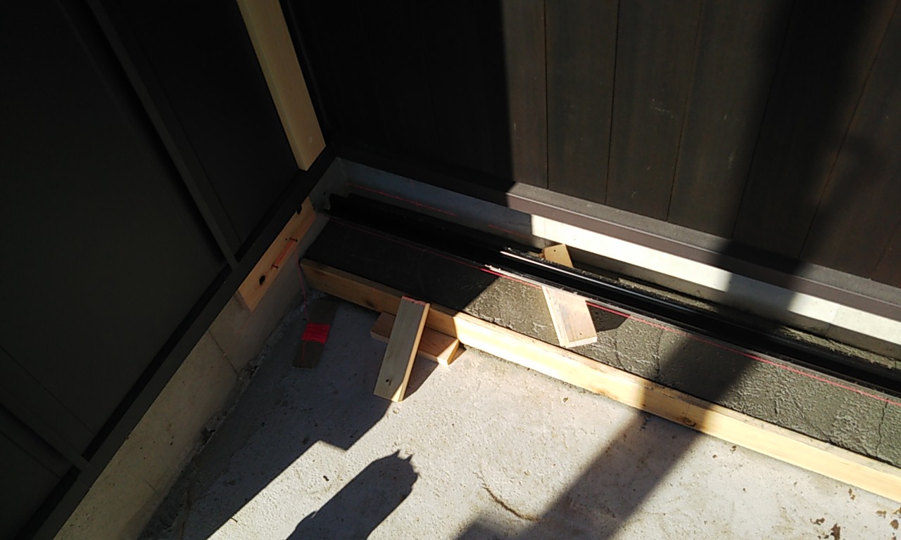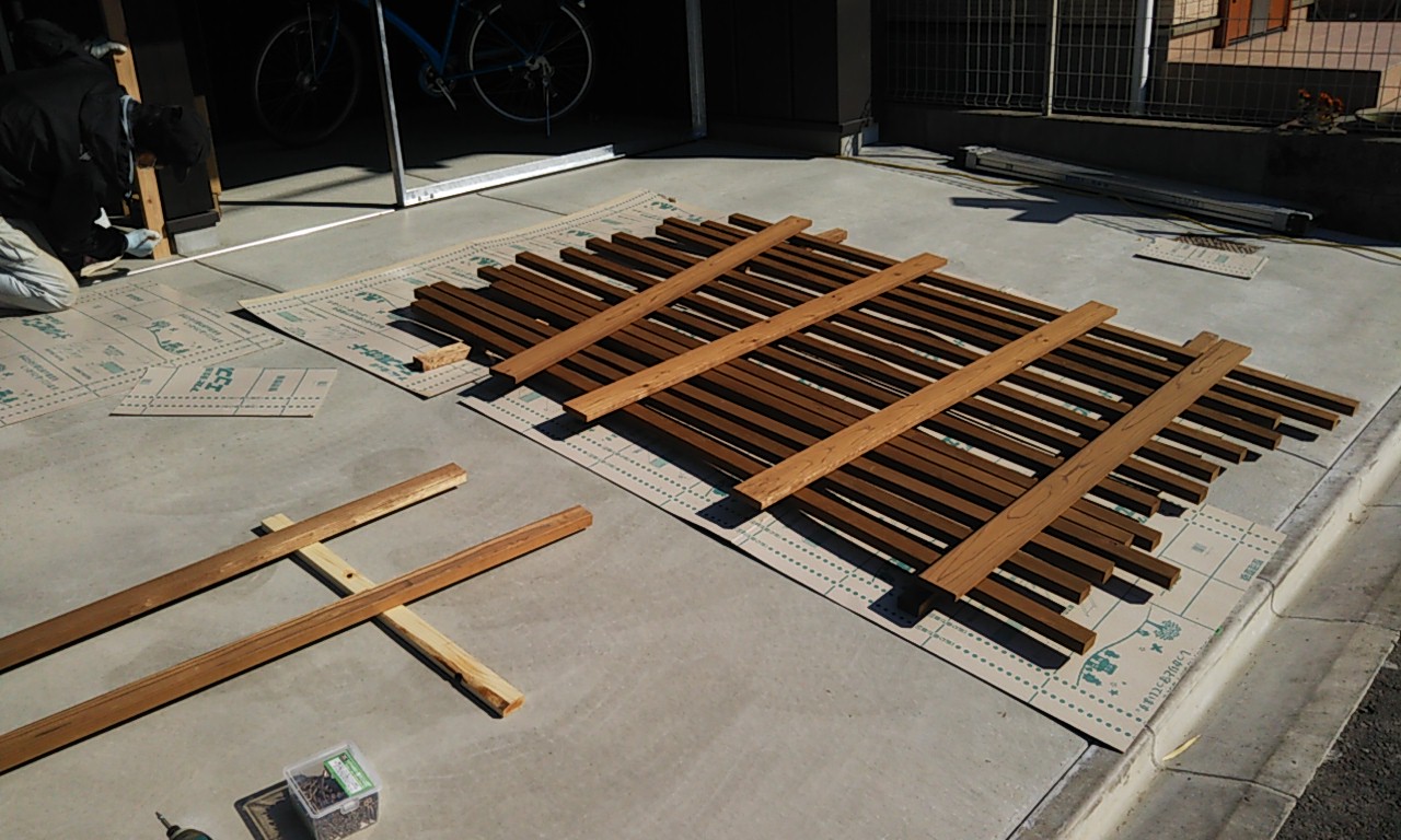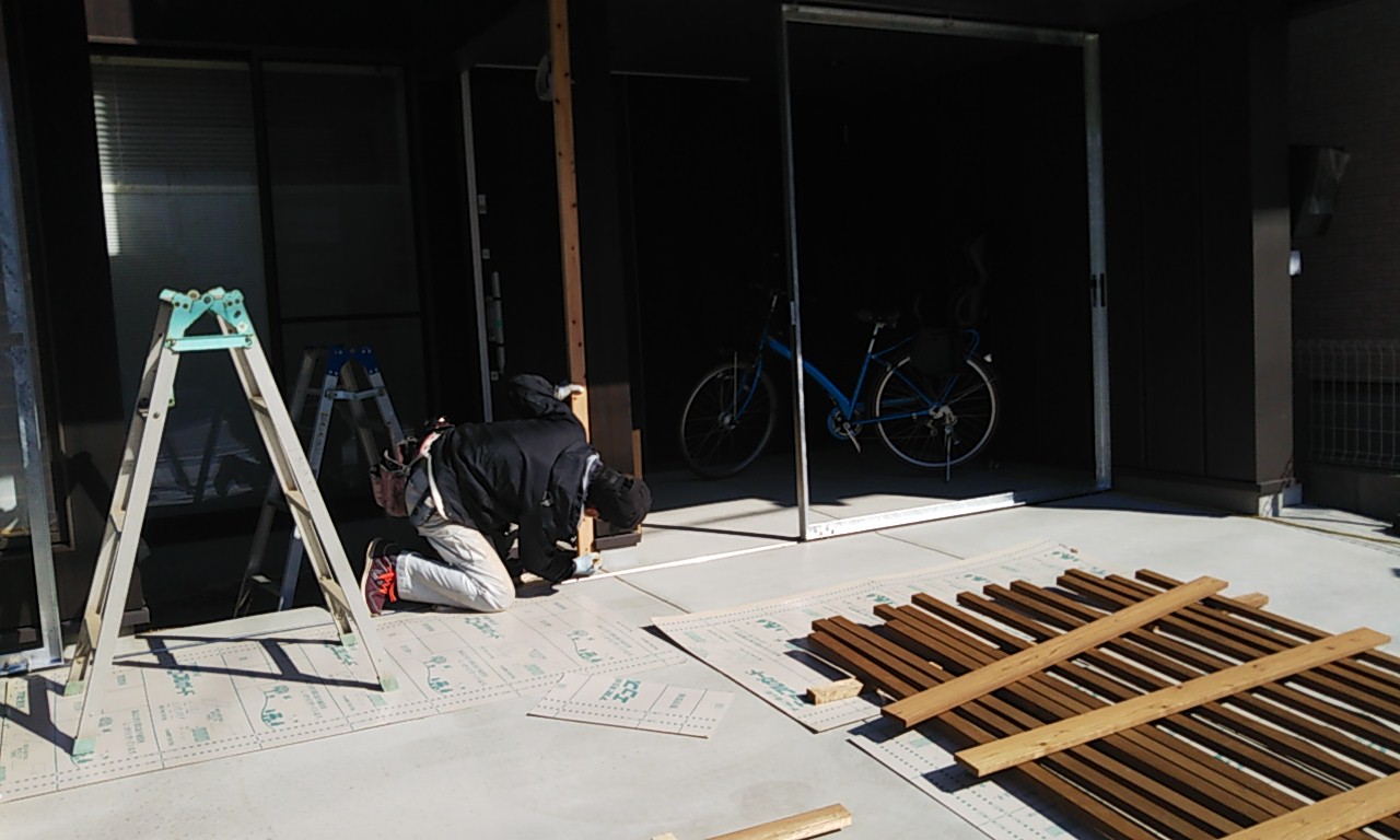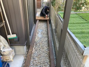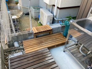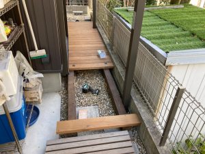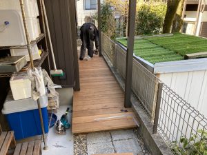 同時に裏庭ではウッドデッキ造りが行われています。巾狭な通路ではあるもののこの敷地内では貴重な物干スペース。室内から楽に出入りできるように段差を調整します。