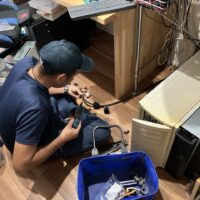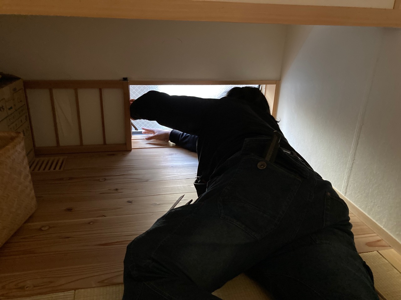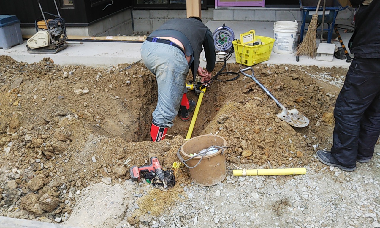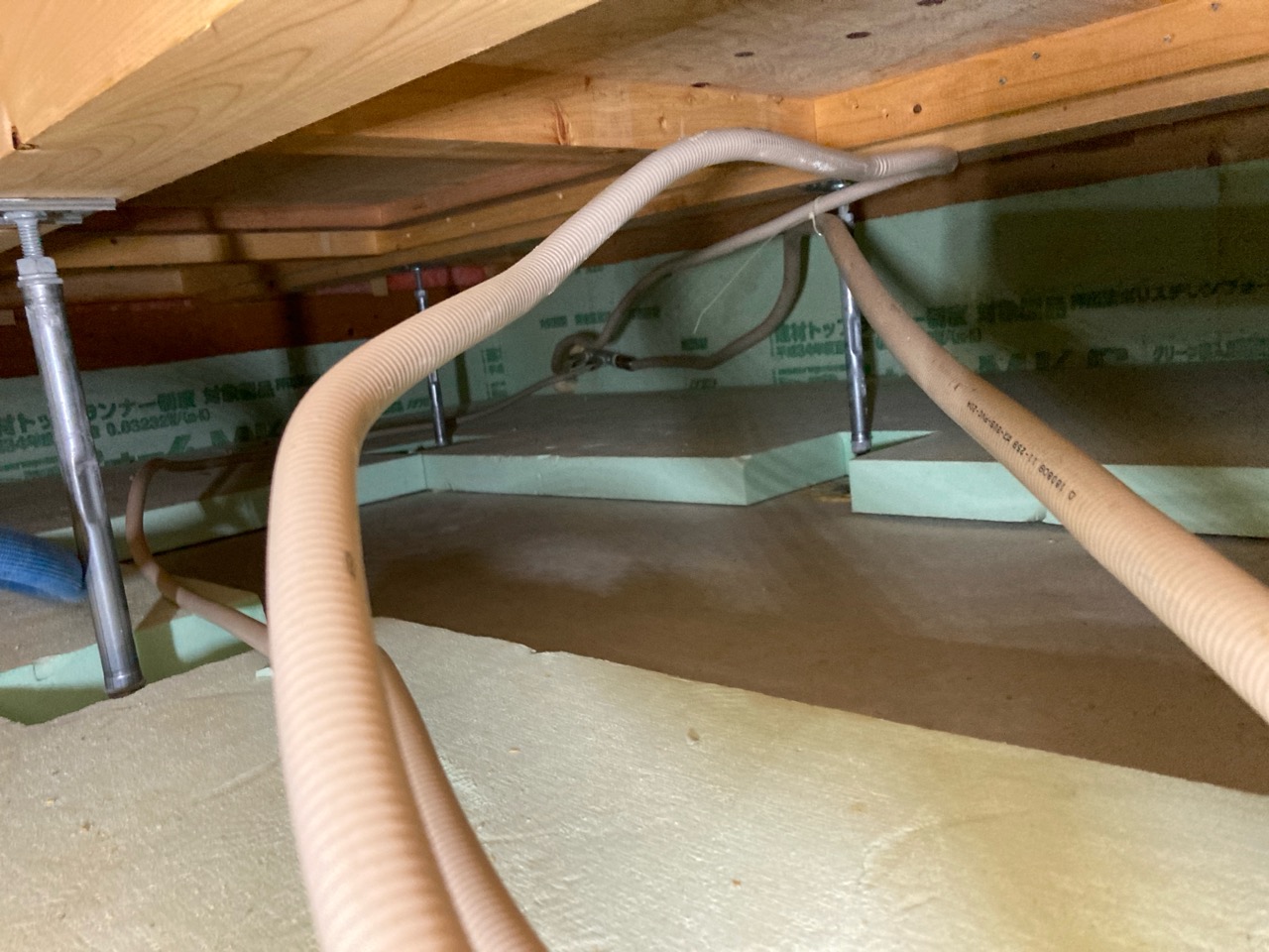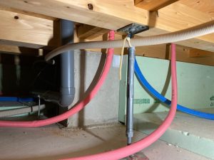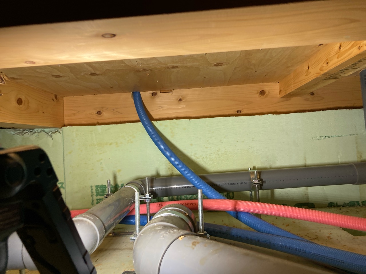 恒例の床下チェックです。車輪の付いた台車に腹ばいに乗り、匍匐前進のように進んでいきます。一定の勾配の必要な排水管はさておき、給水給湯管やガス管がベース付近、高さの中央くらいに配管されていると車輪付き台車で進む際は非常に困難です。それらを乗り越える際は手足に力を込めていかなければならないので建物床下を一周する頃にはかなりへとへとになります。5年前の自分に注意してやりたいところです。