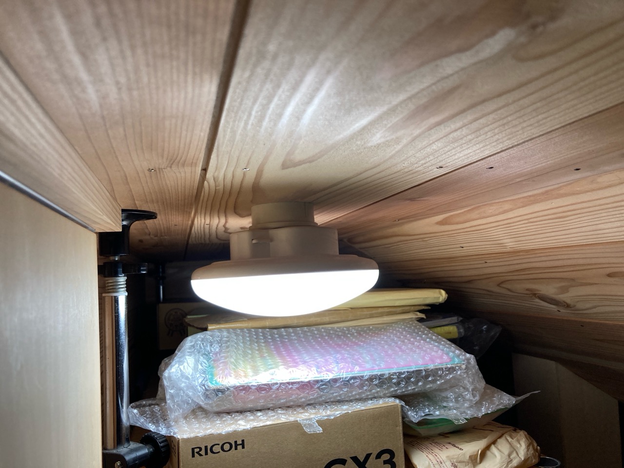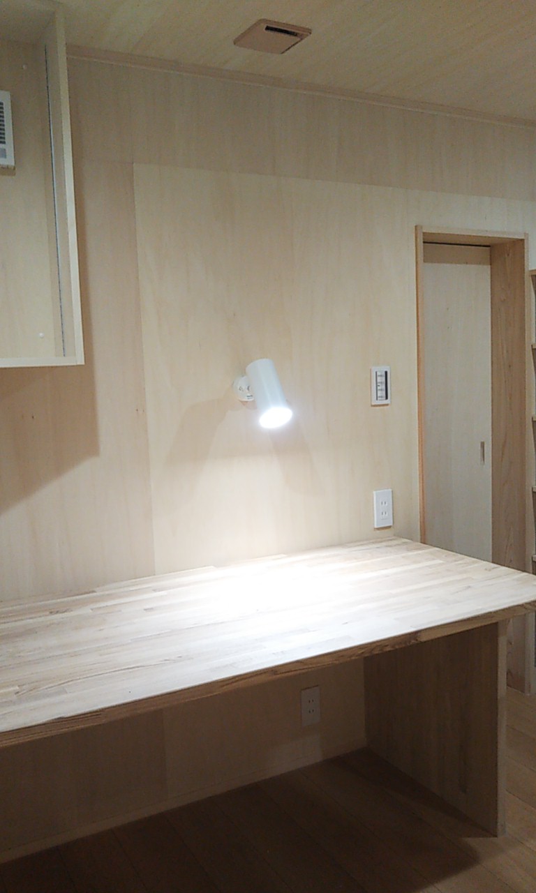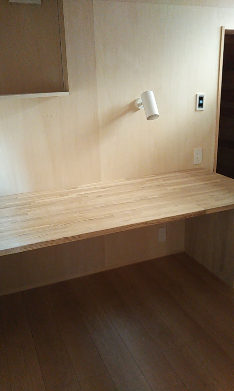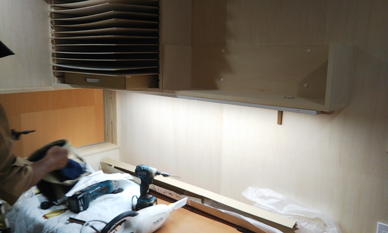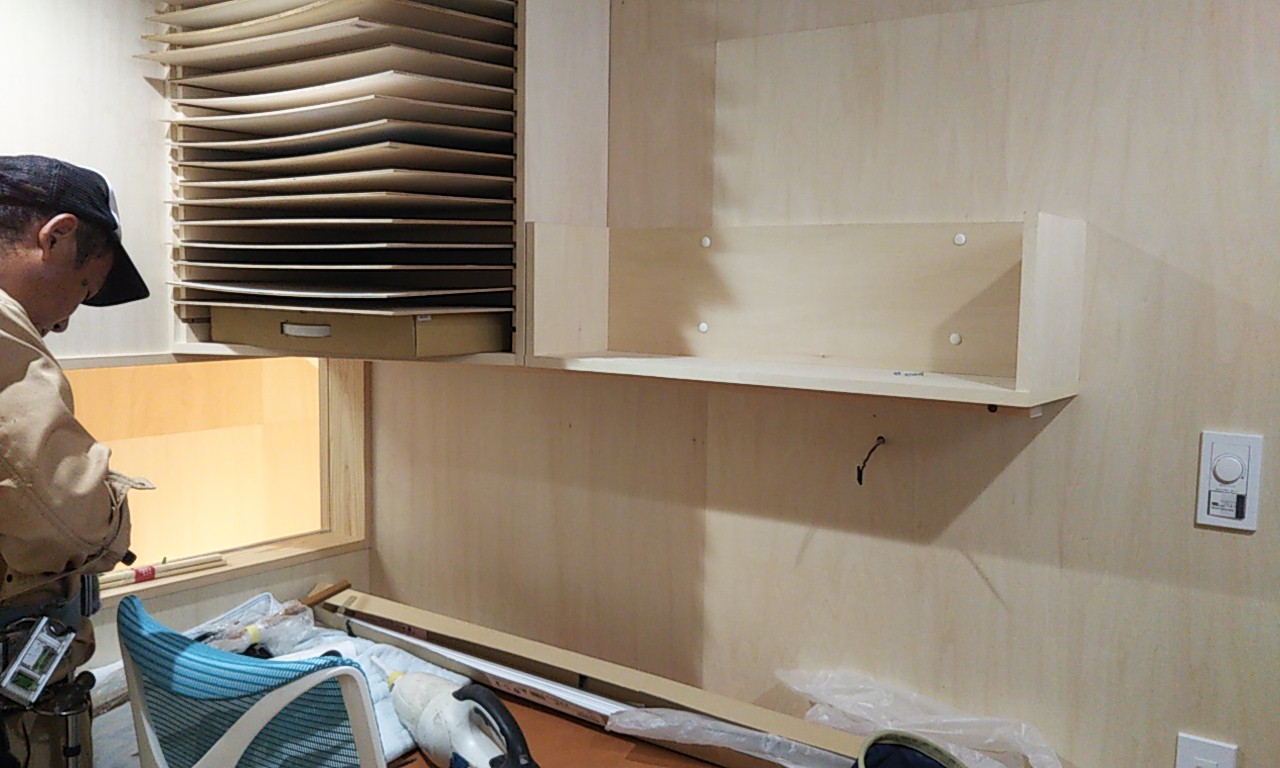 アトリエの棚付け足し工事。机の上の筆記具などを整理する棚として、また、細長い照明器具を取り付けたいために横長の棚を付け足して取付けました。