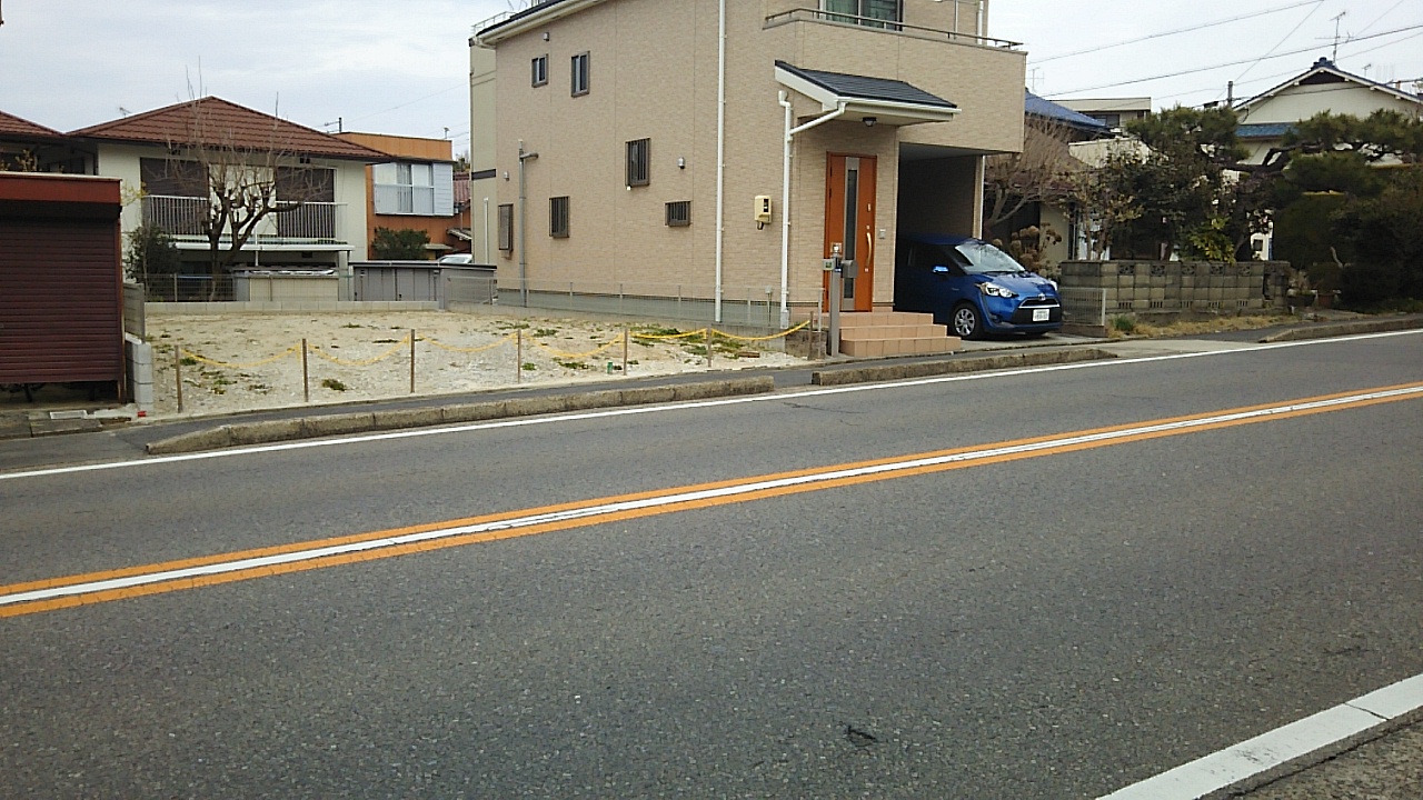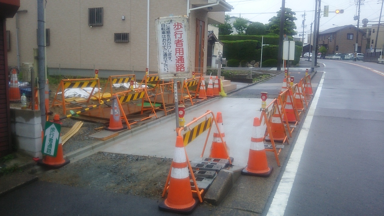 車両の乗入のため、車道と歩道を隔てる縁石の撤去と歩道のコンクリート舗装を市指定の業者にお願いしました。これにてやっと重機などの敷地への乗入が行えます。ここから工事はどんどん進めていきます。