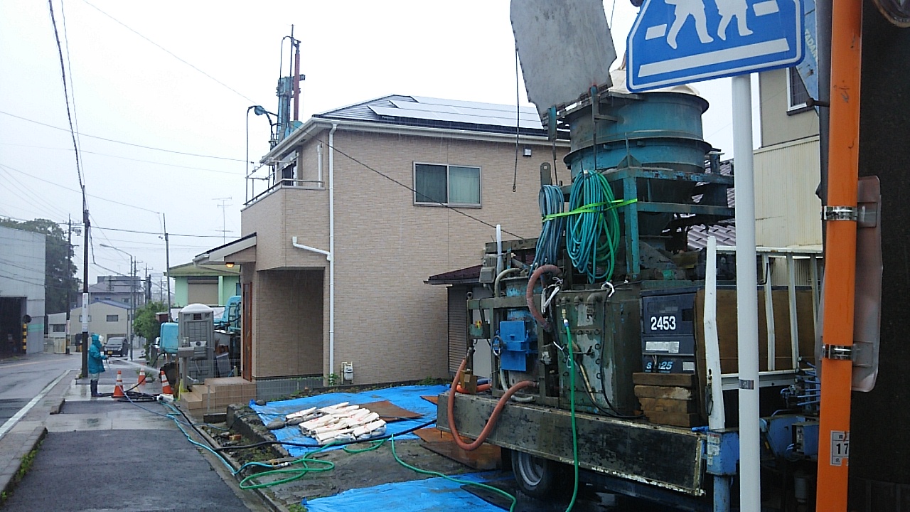 地盤改良工事。またもやアースオーガーの巨体が現れました。敷地が狭小のため、お隣の敷地をお借りする事ができました。プラント車をお隣りへ停め、何とか工事をする事ができます。