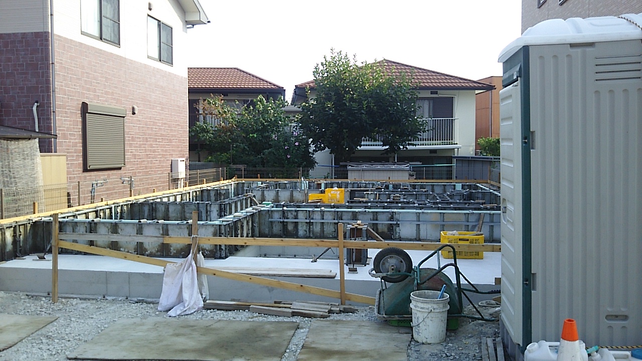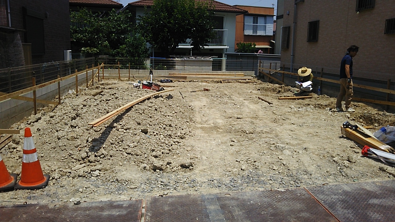 基礎コンクリートのための配置出し、丁張りを行いました。正午過ぎからは日陰の無くなる灼熱の現場。時期も時期、熱中症には十分お気を付けください。