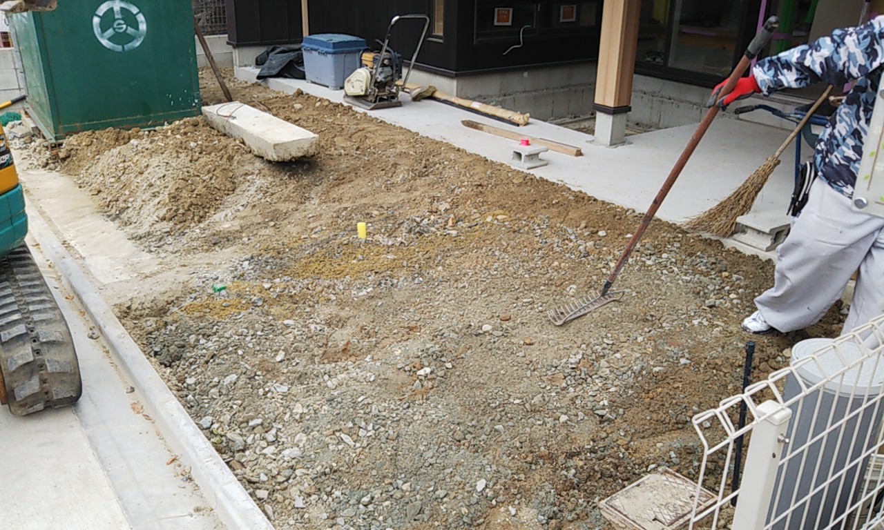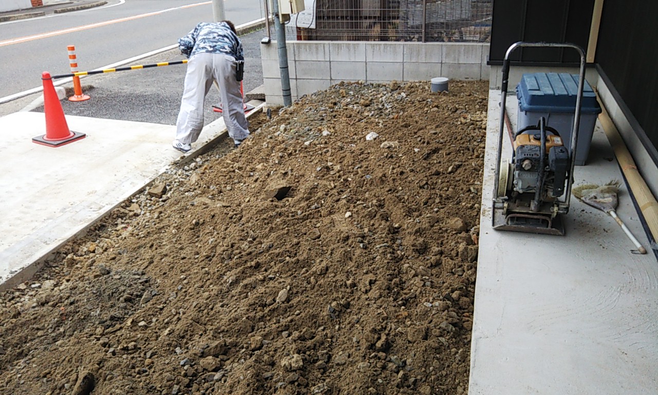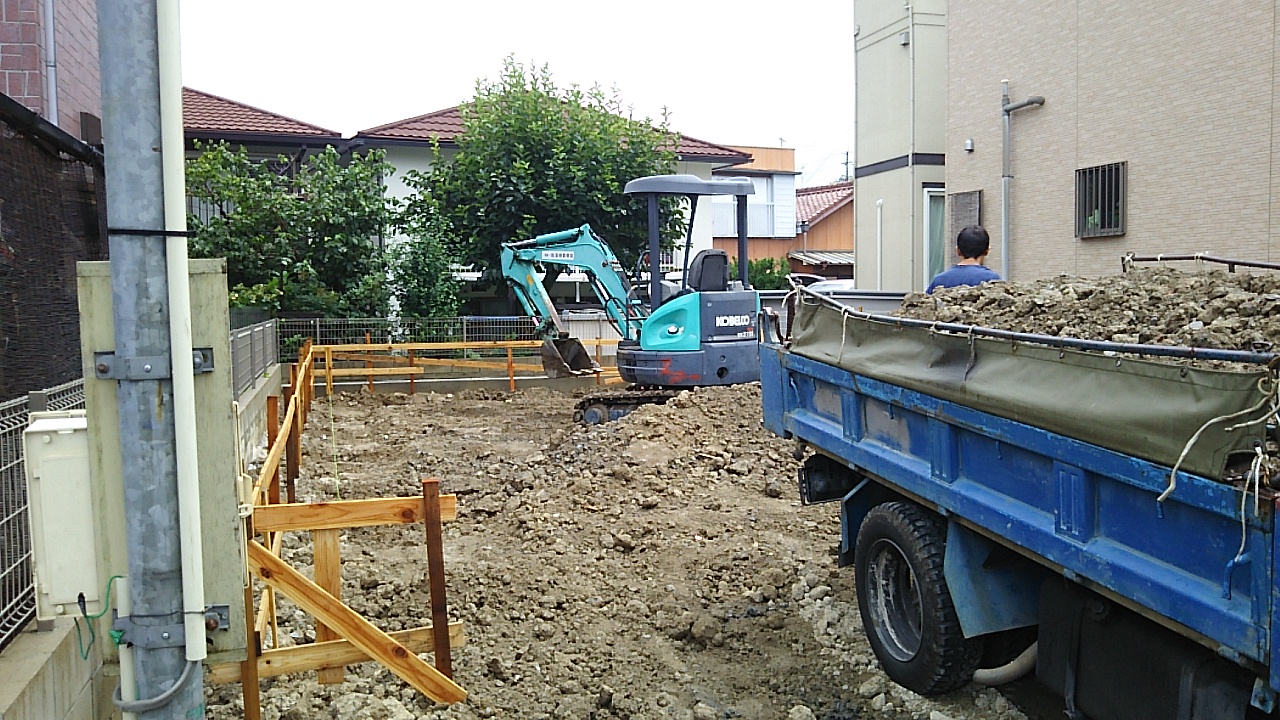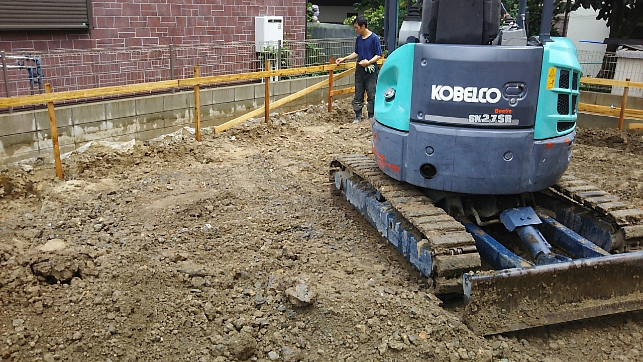 歩道の乗入工事も終わり、敷地内に重機が入れるようになりました。さっそく土の掘方開始です。