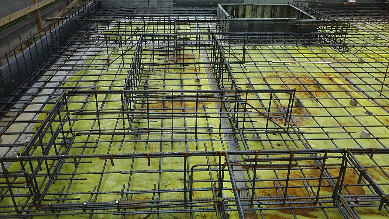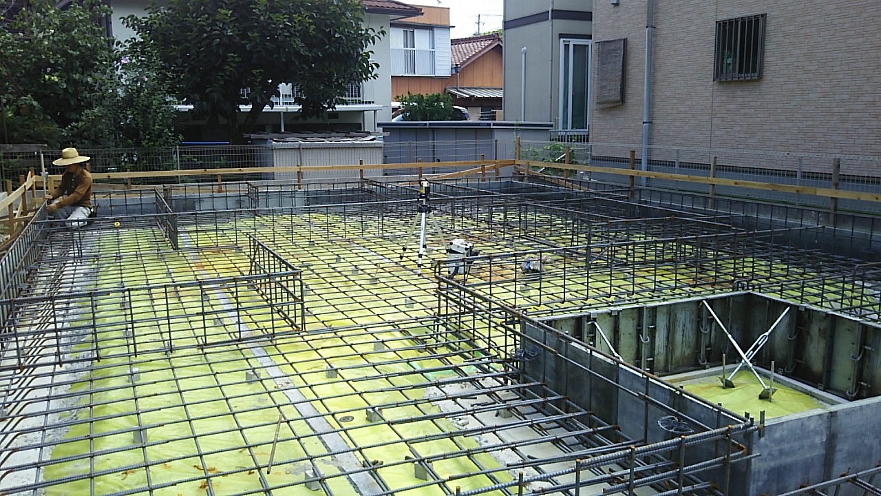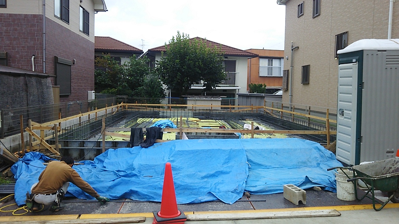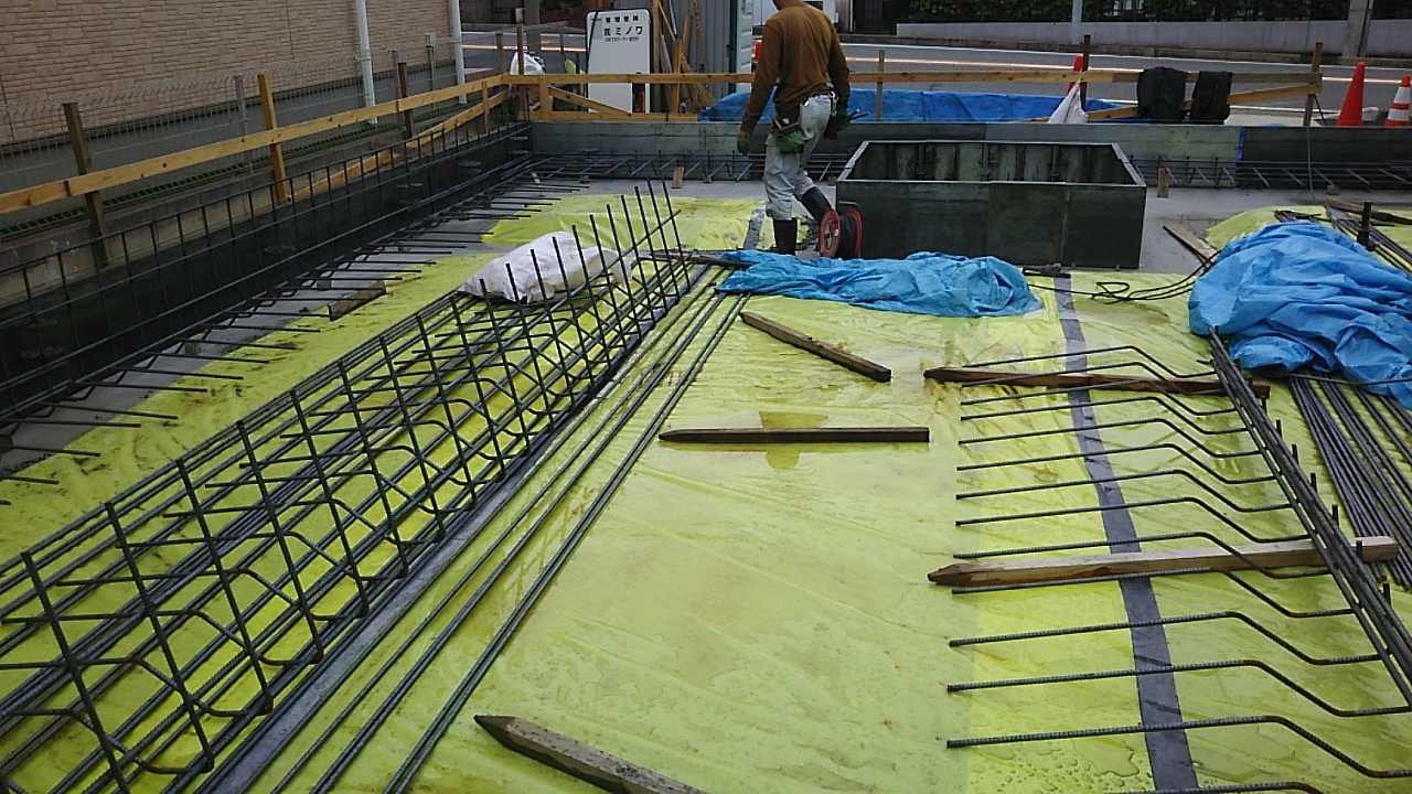 配筋工事。雨が降ればカッパを着て、やめば脱いでと、かなりメンドクサイ天気です。職人さんにはご苦労をかけます。