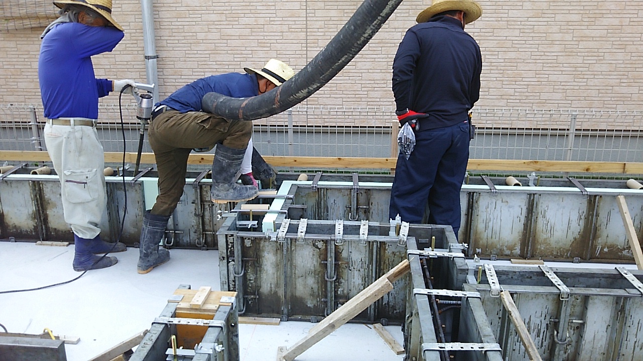 立上りのコンクリート打設。連日猛暑日が続きますが、今日も例に漏れず酷暑です。加えて水和熱の発生するコンクリートの上。まだまだ柔らかいコンクリートの中へ職人さんの汗が滴り落ちます。