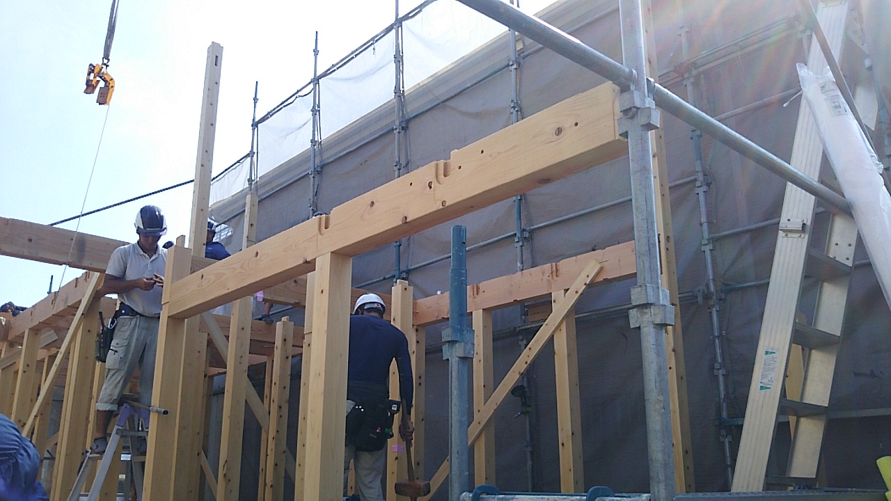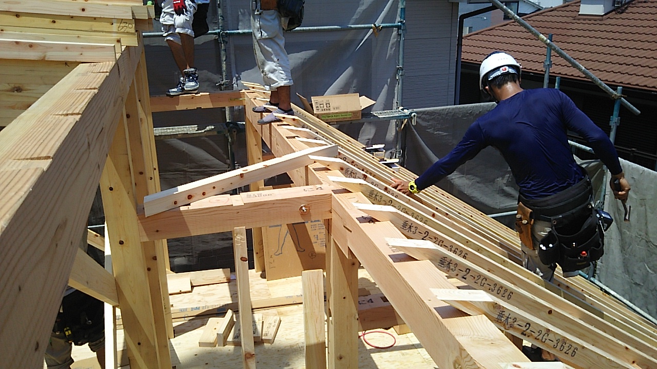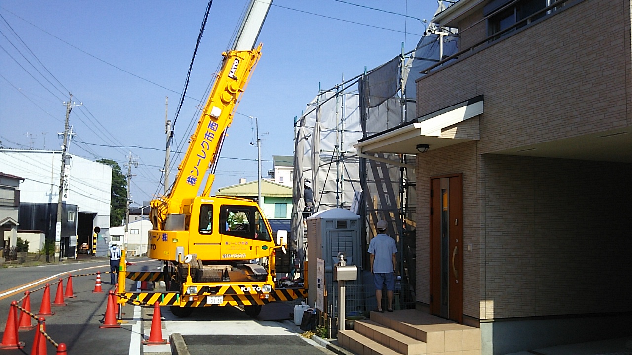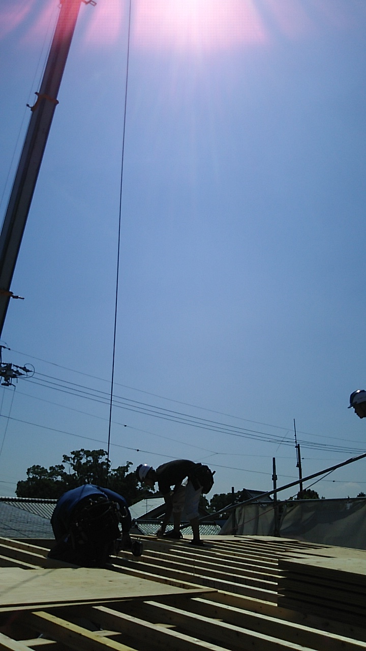 名古屋市k様邸の上棟が始まりました。連日普通に猛暑日が続く中、行われます。『猛暑日と言ったって、35℃くらいでしょ?』と、もう慣れっこになってしまいました。外部で作業をしていると、40℃だと言われてもあまり驚きません。