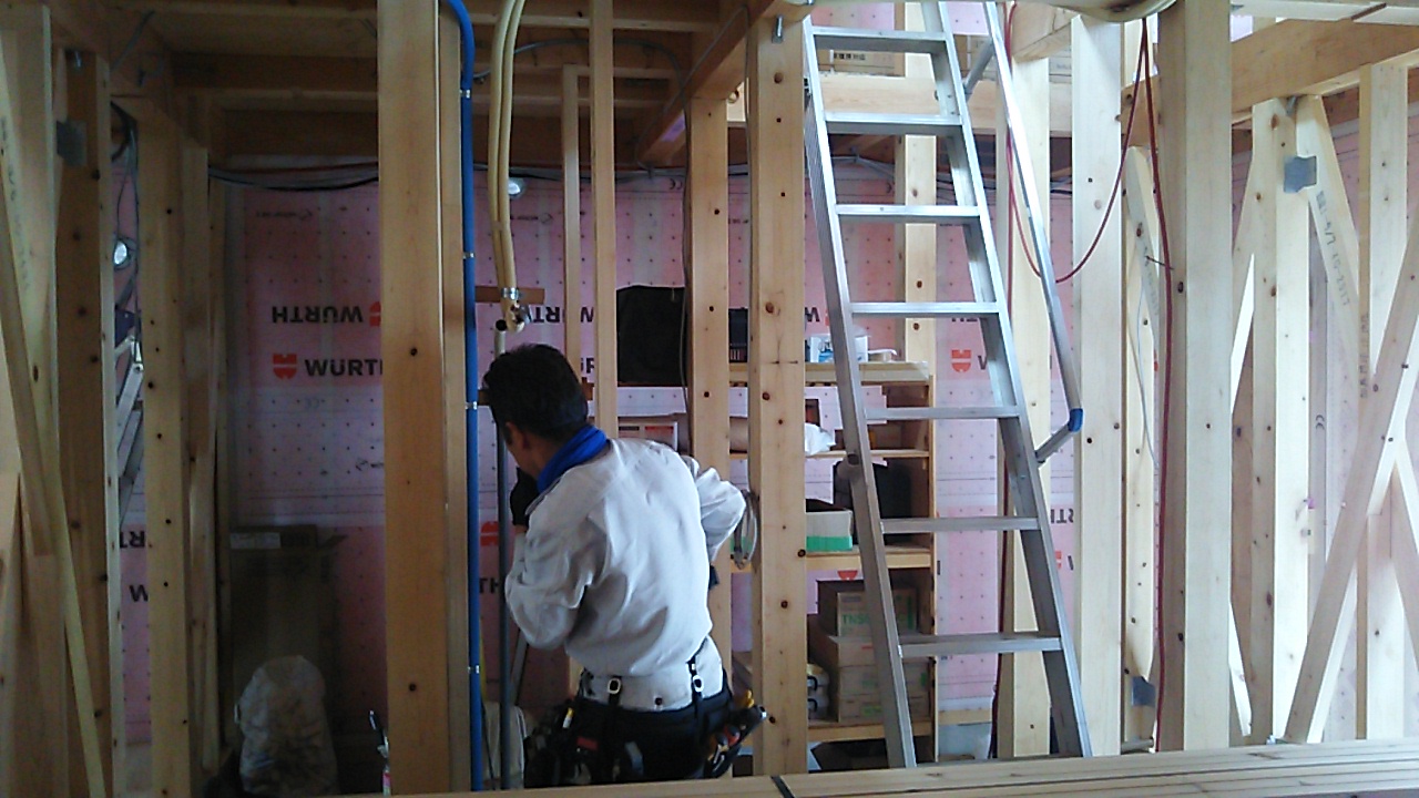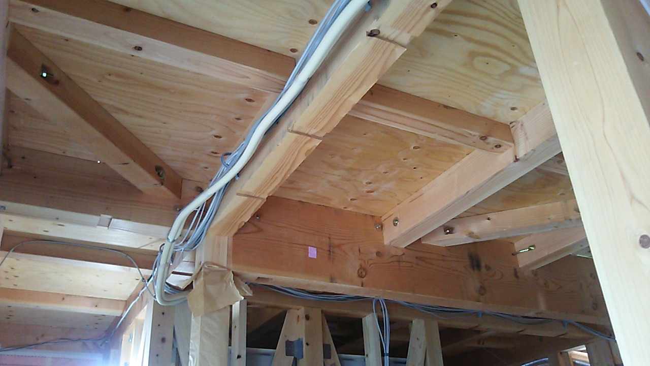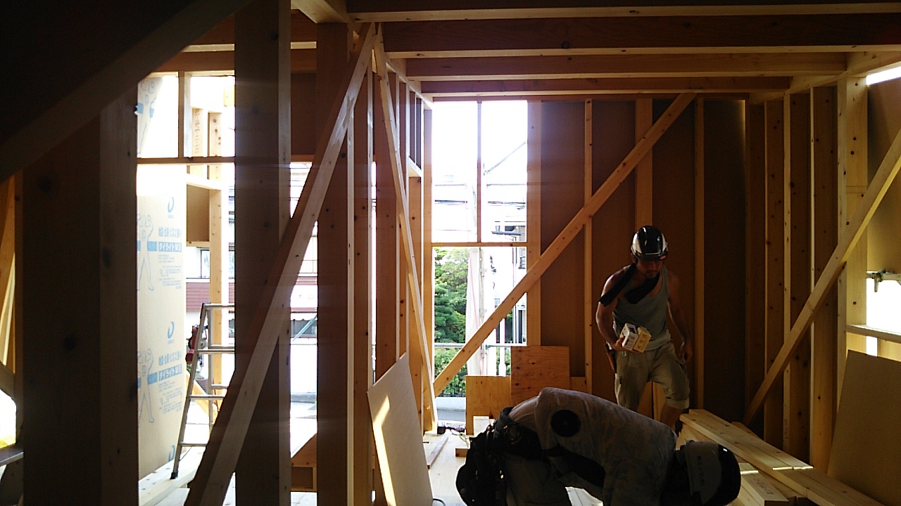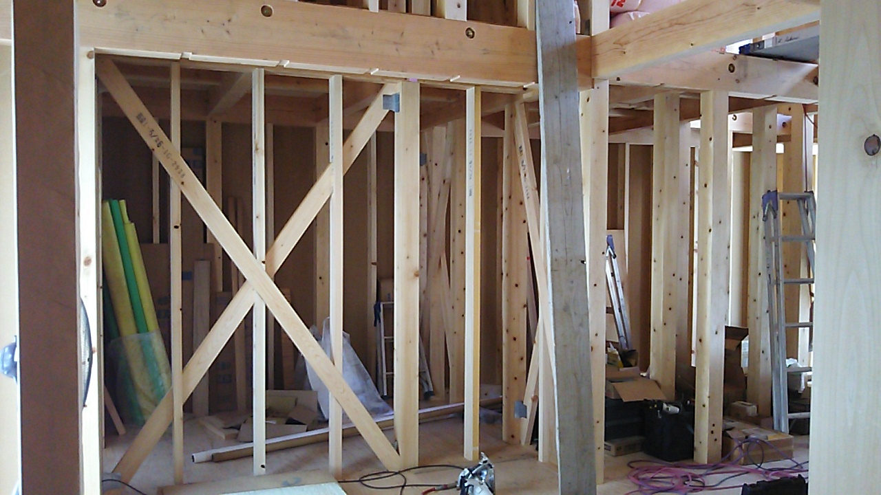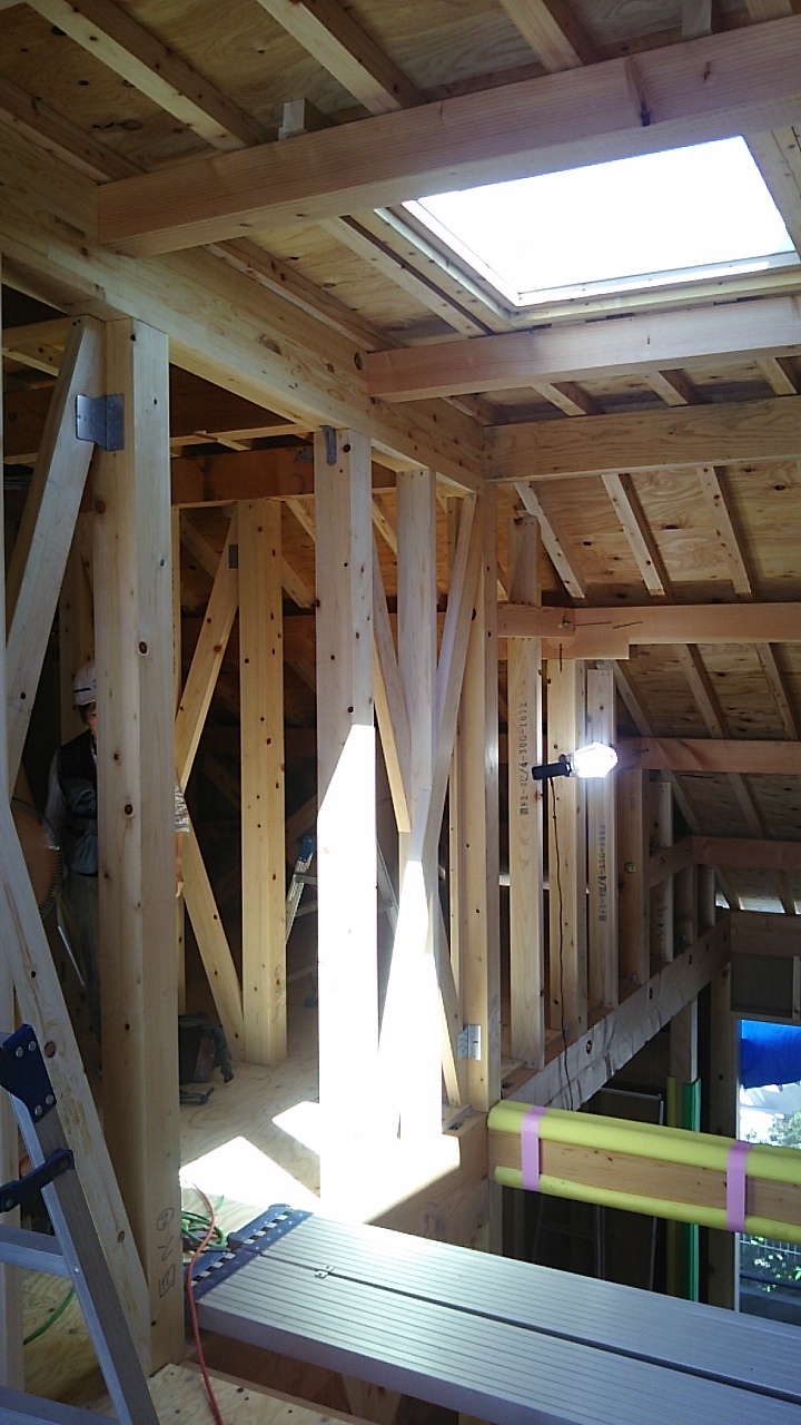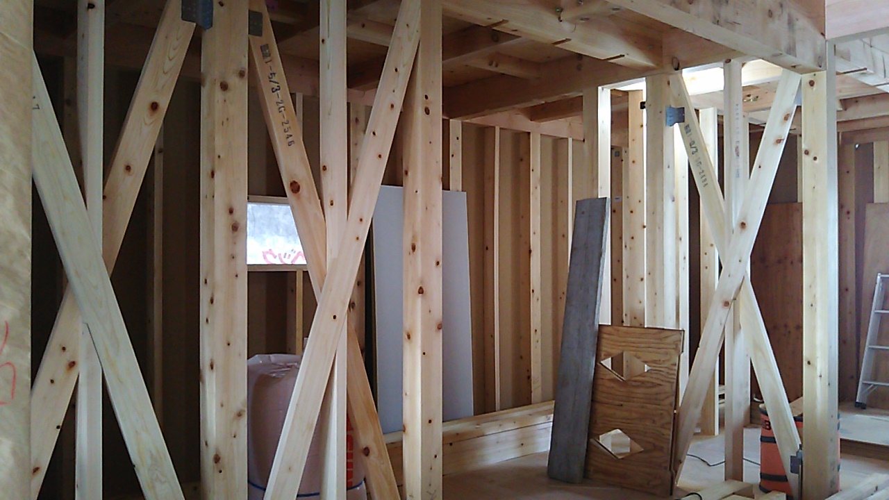 筋違耐力壁の取り付けが進んでいます。細かい部屋が多く、筋違も多いので、材料の搬入等、少し気を遣う必要があります。