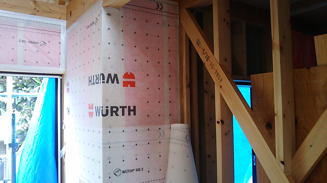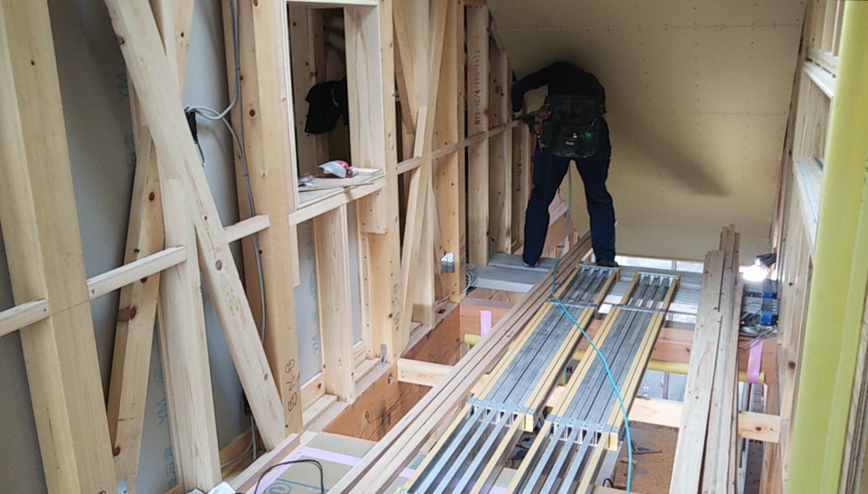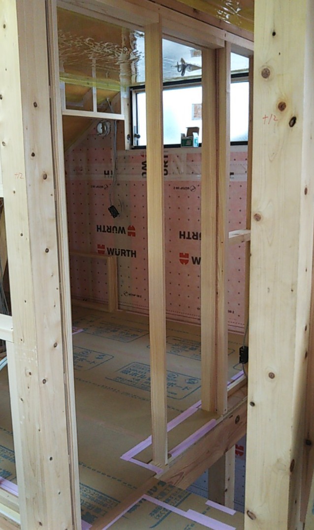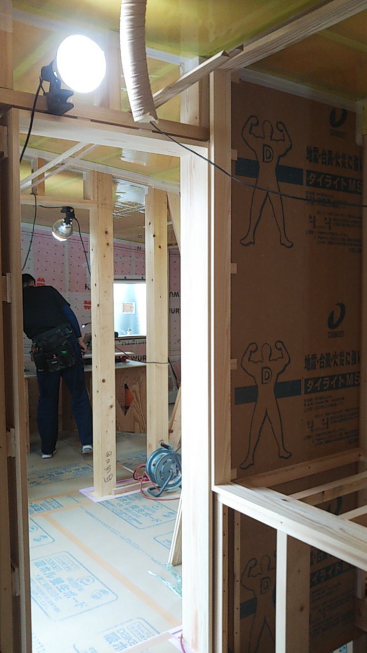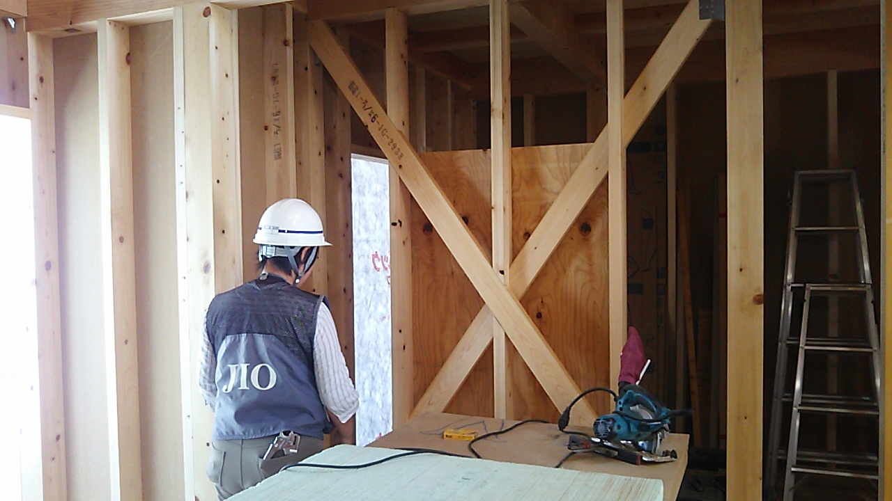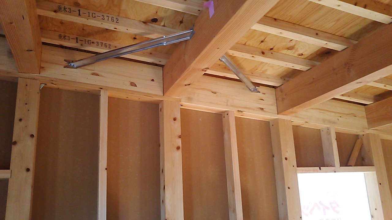 筋違耐力壁の取り付けが進んでいます。細かい部屋が多く、筋違も多いので、材料の搬入等、少し気を遣う必要があります。