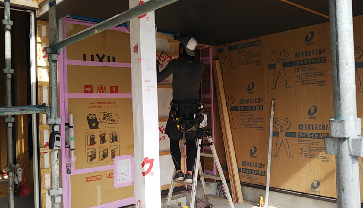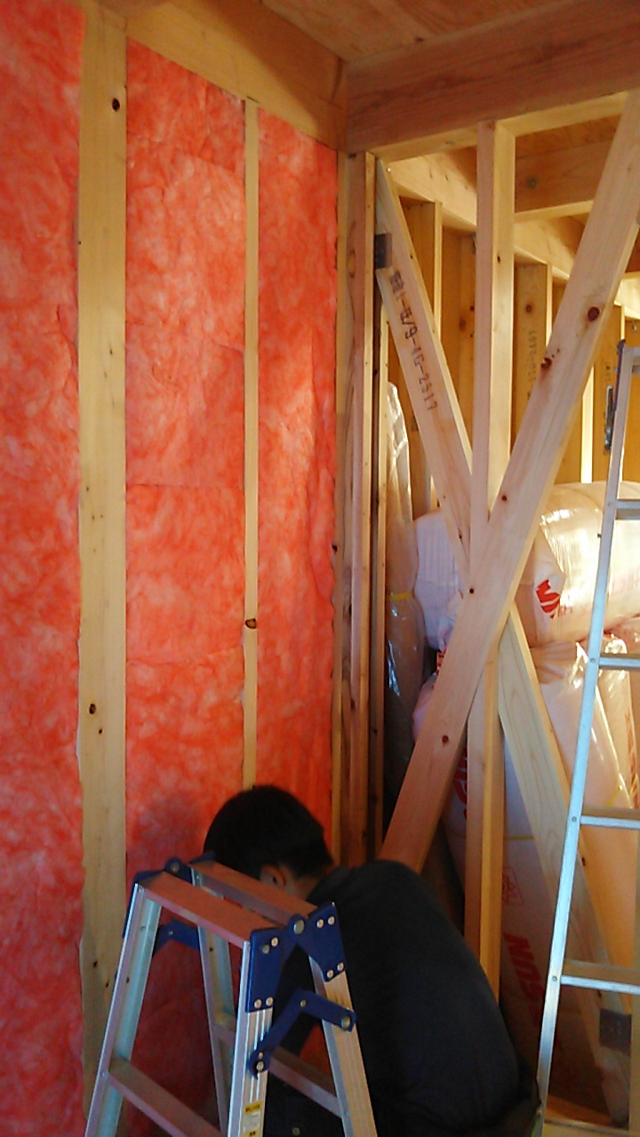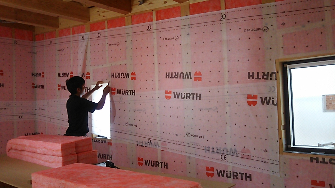 断熱材の敷設工事。壁の中にグラスウールを隙間なく詰めていきます。しかしこれだけでは『高断熱』を施したのみ。わずかな隙間から室内の熱は外部に漏れていきます。それを防ぐために断熱材の上からシート張を行います。このシートを敷設する事によって隙間を防ぐ『高気密』を実現するのです。これら両方をしっかりと行う事によって『高気密高断熱住宅』はつくられていきます。