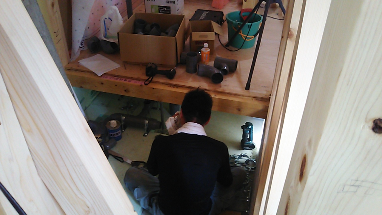 水道配管工事。あまり陽の光の当たらない部分の仕事とは言え、風も吹かないので暑い中、床下で仕事をしてもらっています。
