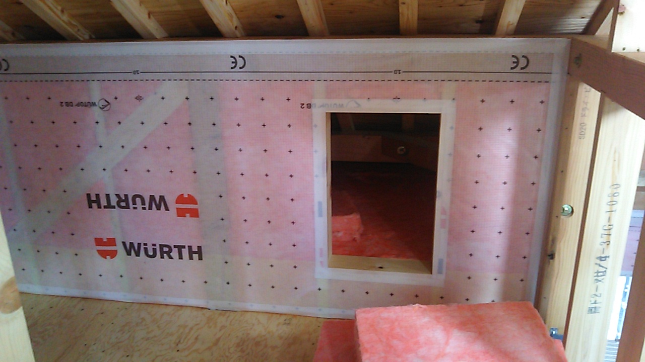 一部小屋裏の断熱材を施工。断熱材で囲われた部分より外側(屋根の低くなっている側)は小屋裏にあるものの、温熱環境的には『外部空間』として扱います。しかし構造的には『内部空間』なので、垂木の間を通って通気をすることが必要です。