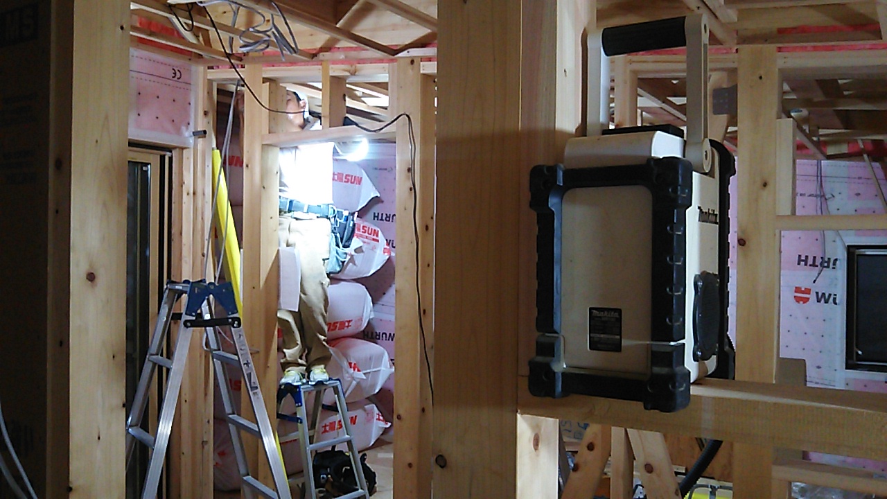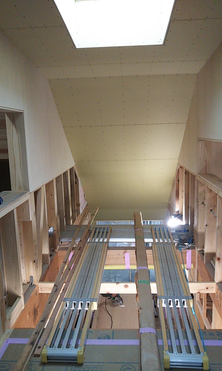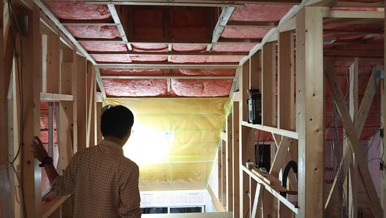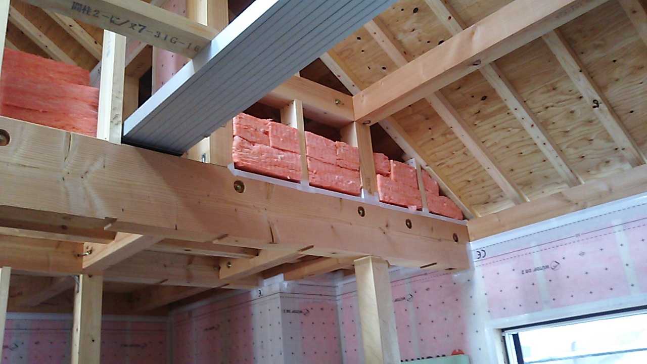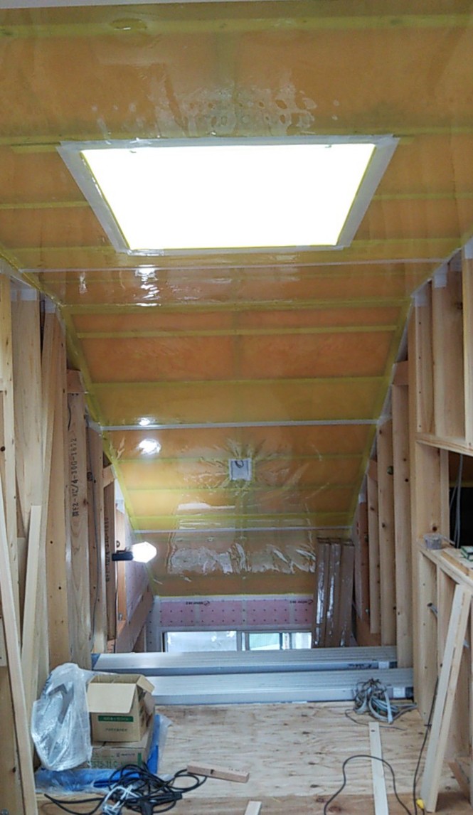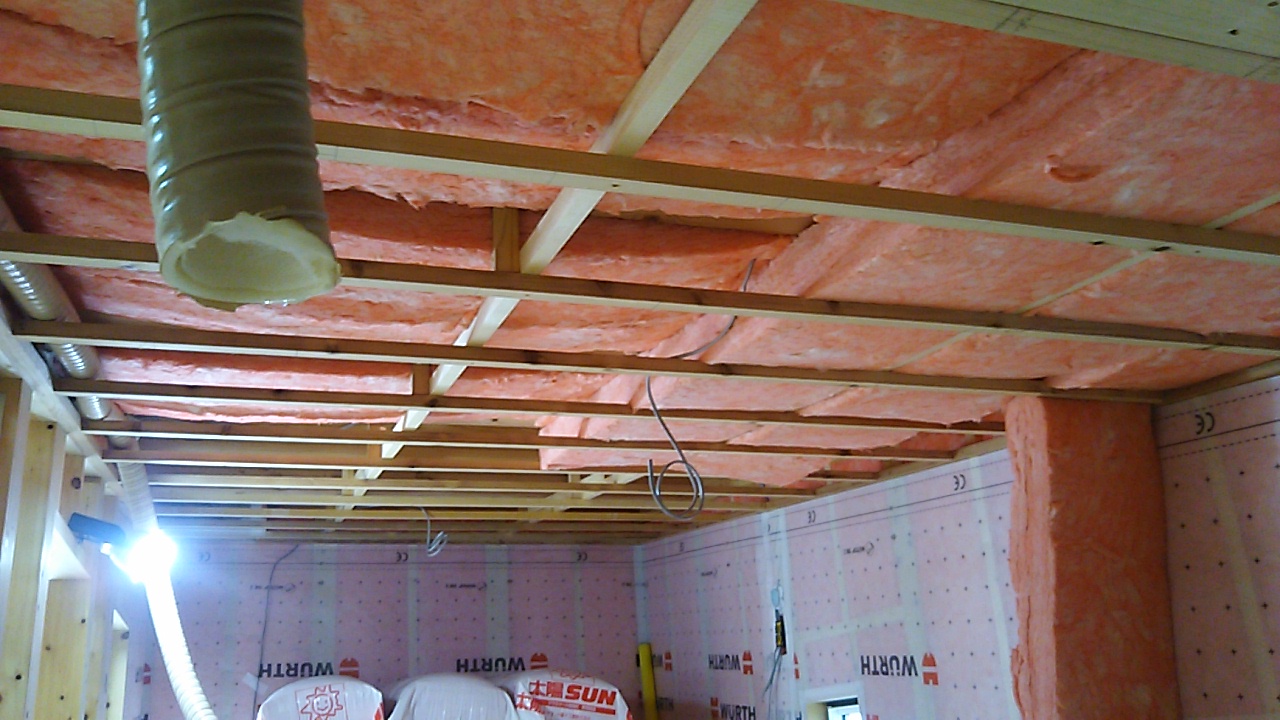 天井の断熱材を敷設。これで残暑における鉛直方向の日射の熱が少しは抑えられるでしょう。