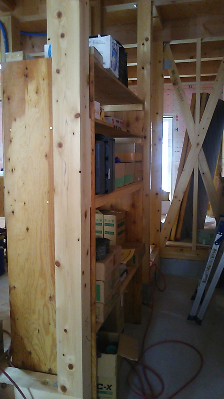 現場内に据えられた道具や釘ビス類を整頓する棚。担当してもらう大工さんにもよりますが、今回の棟梁はミノワの中でも一、二を争う無類の整理整頓上手の大工さんです。こういった棚や作業台はたまにお客様から『現場が終わっていらなくなったらください。』と言われることもあります。