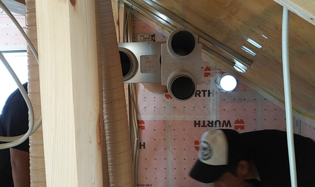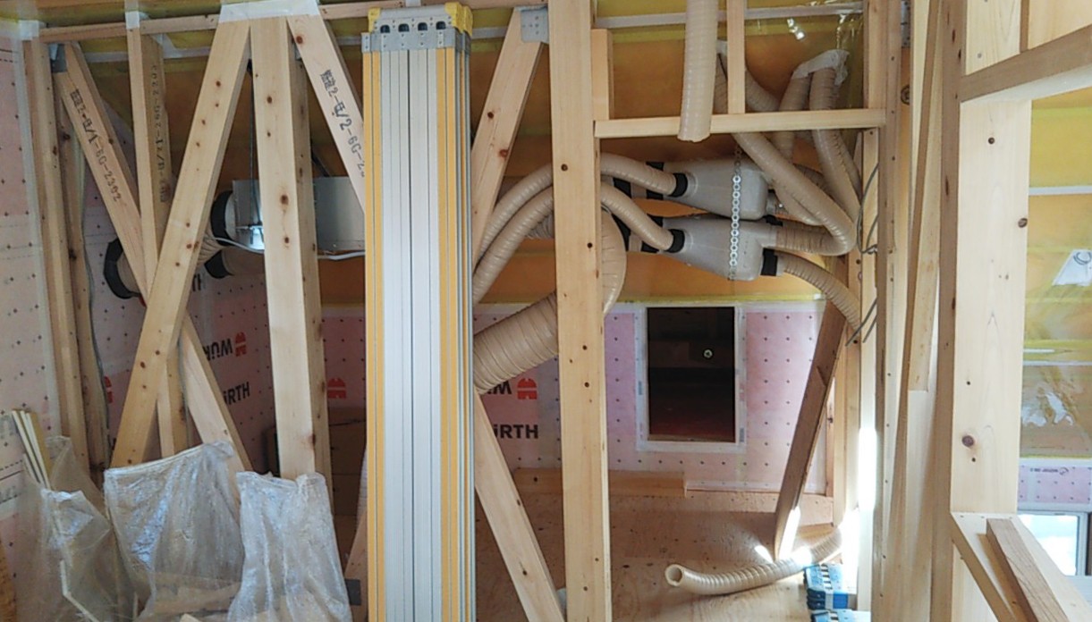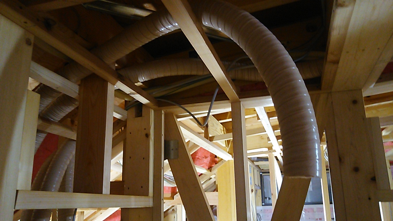 熱交換換気扇吊り込み。今回は2階から通じる小屋裏の部分(と言っても下屋ではなく、屋根の勾配が変わって天井高さが低い部分です)を機械室とし、換気扇やダクトを集中させて配置します。プランによりますが普段は天井点検口を開けた上部に配置される事が多く、フィルターの掃除などは脚立が必要ですが、こういった部分に取り付けるとその必要はなくなり、メンテナンスは楽になります。