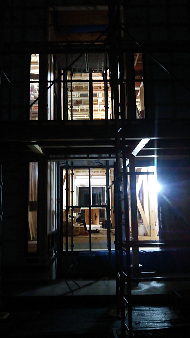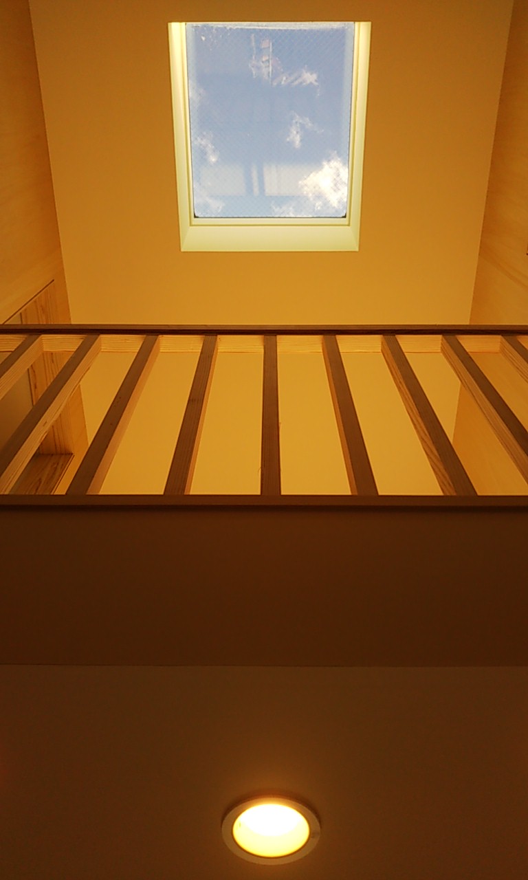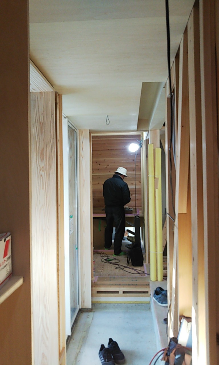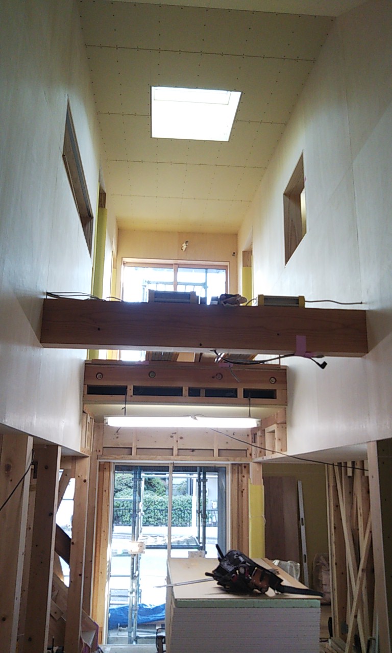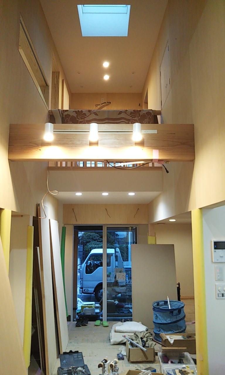 天窓が取り付きましたので、上部から明るい日射しが降り込んでいます。設計士さんの掲げる『露地のような空間』決して明るすぎず暗すぎず、程よい明るさではないでしょうか。