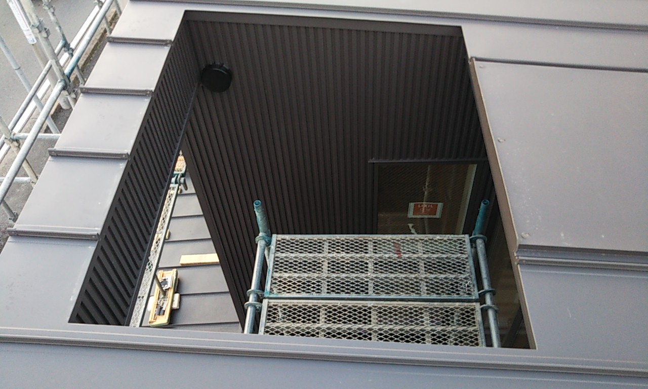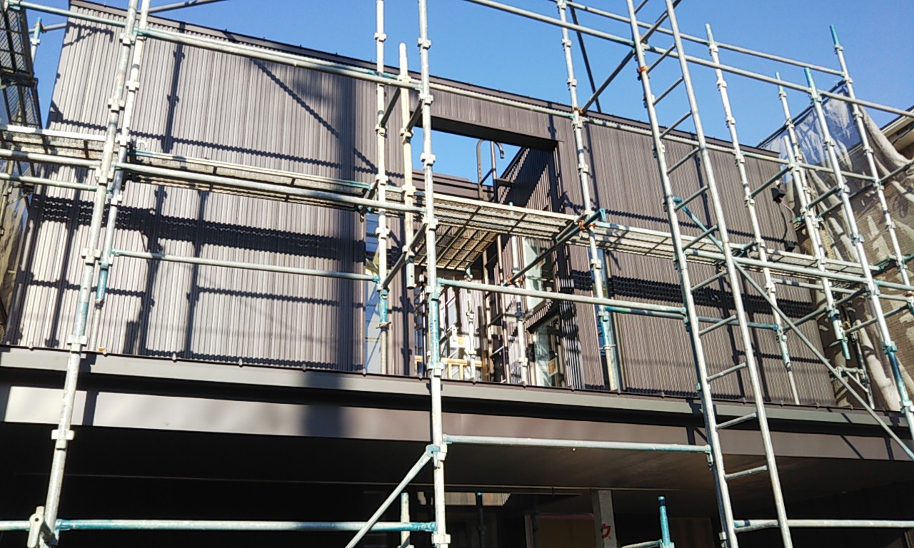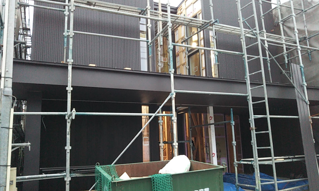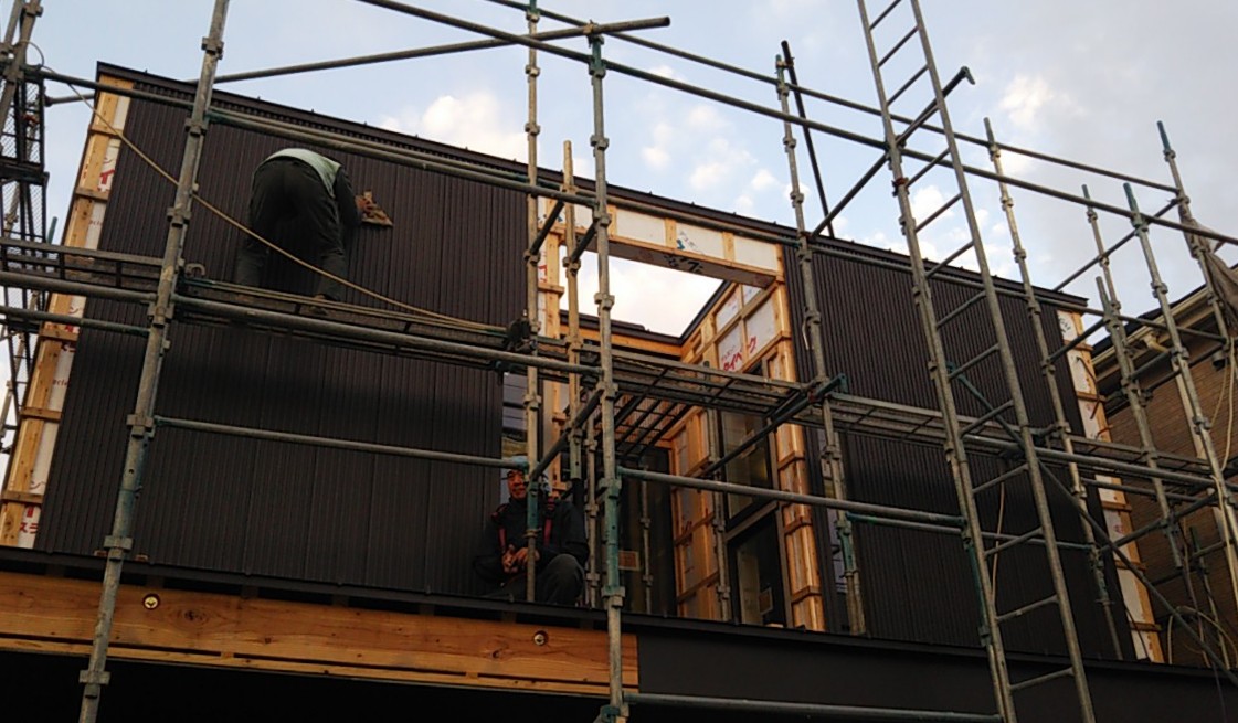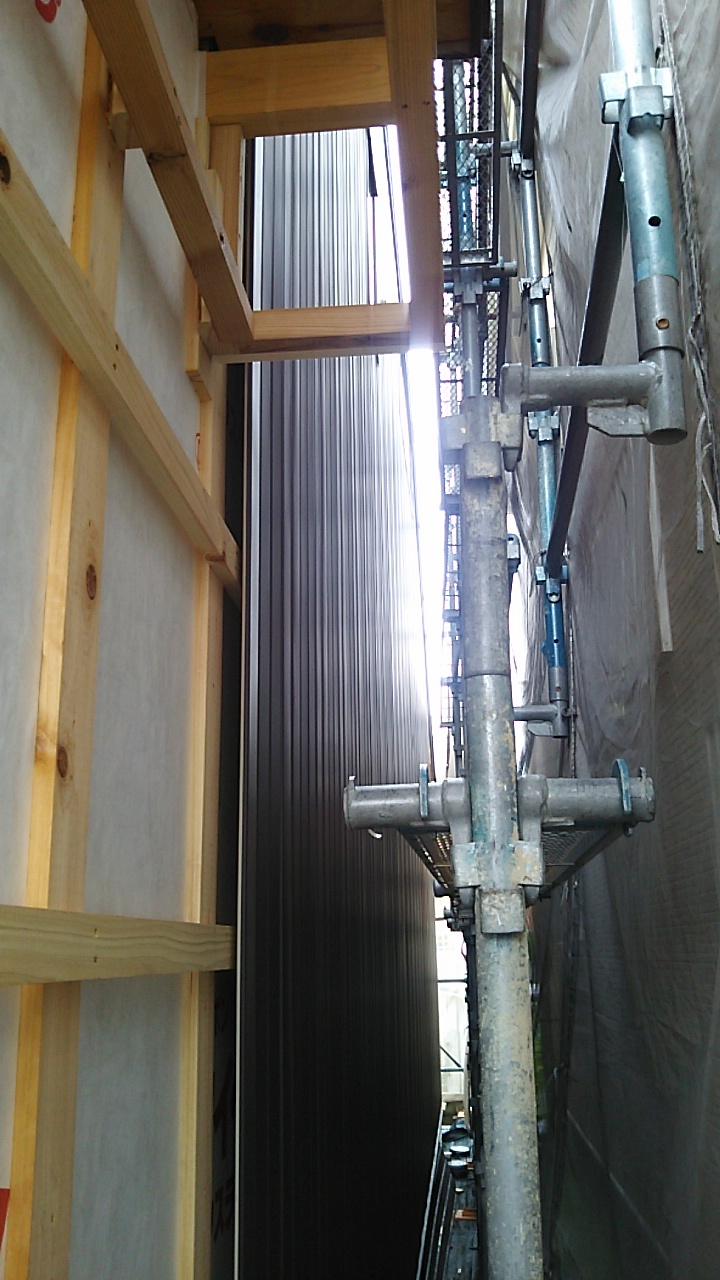 外壁のガルバリウム鋼板が張れてきています。現場の東西は非常に狭いスペースのため、職人さんにはだいぶ苦労して張ってもらっています。