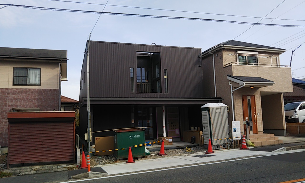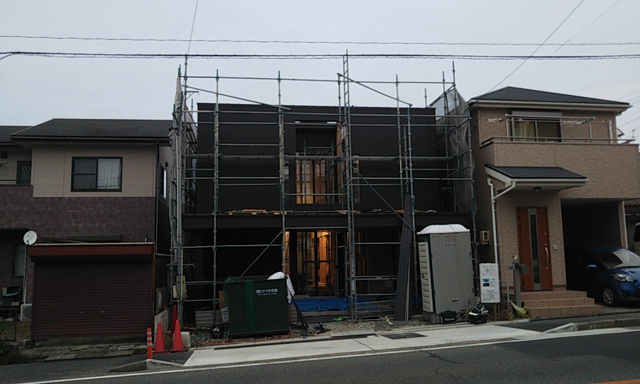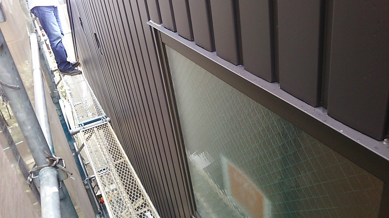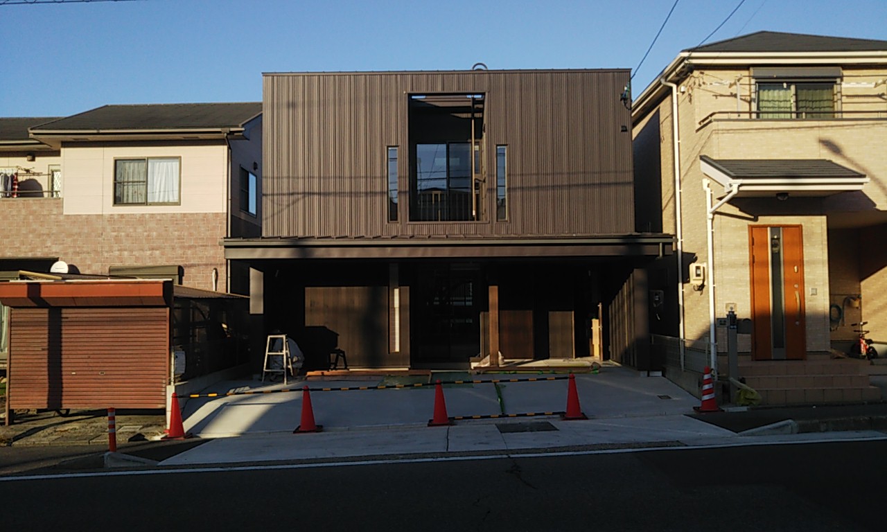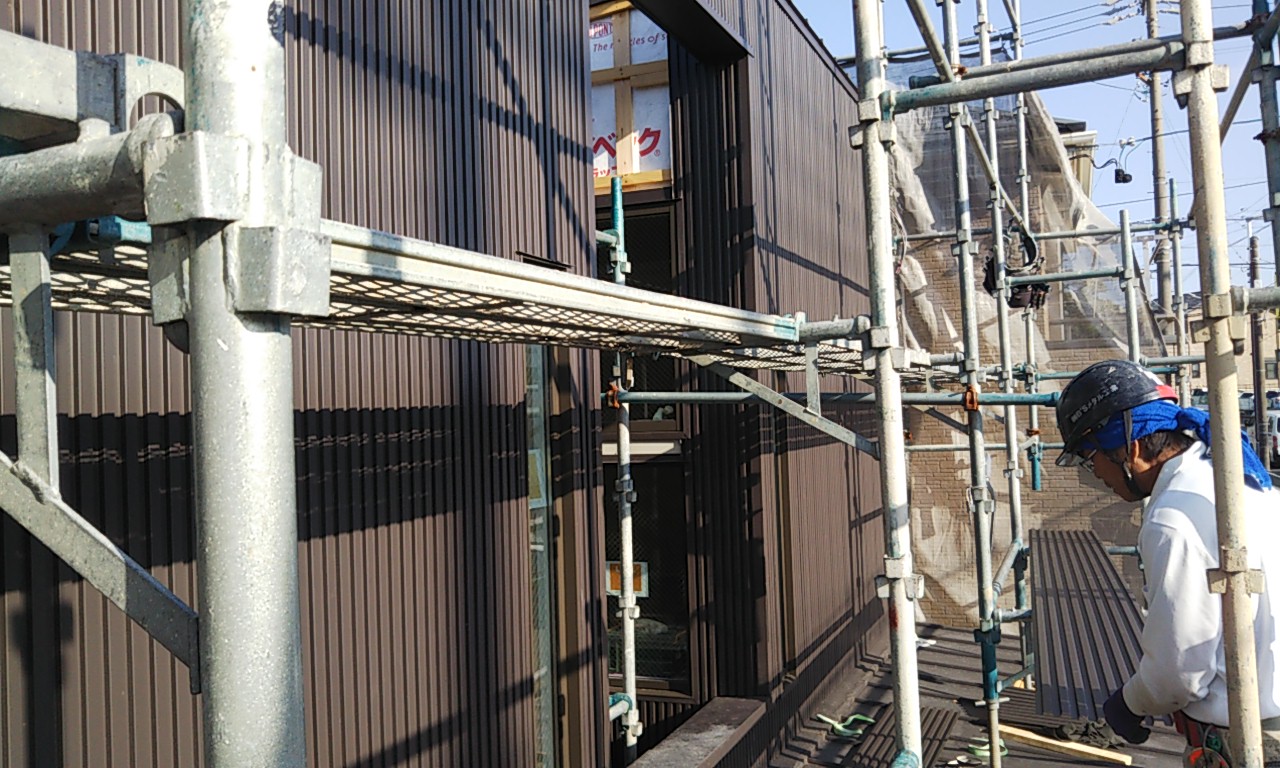 外壁のガルバリウム鋼板が張れてきています。現場の東西は非常に狭いスペースのため、職人さんにはだいぶ苦労して張ってもらっています。