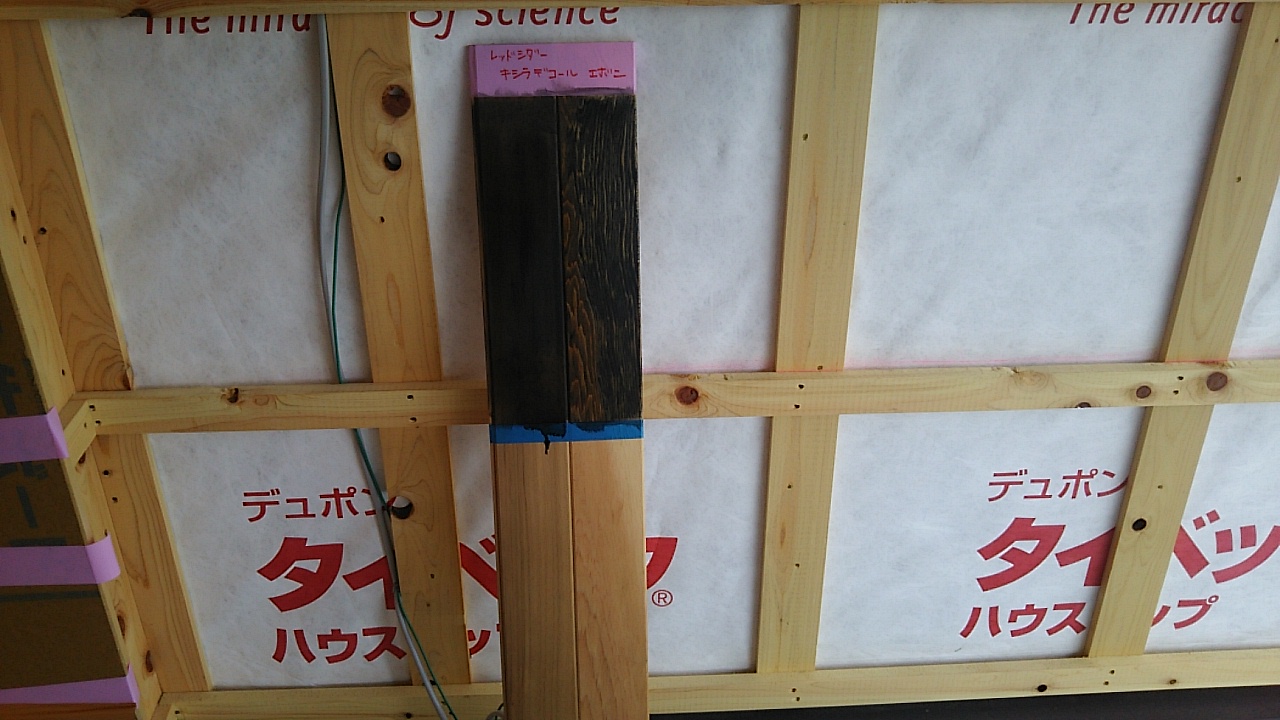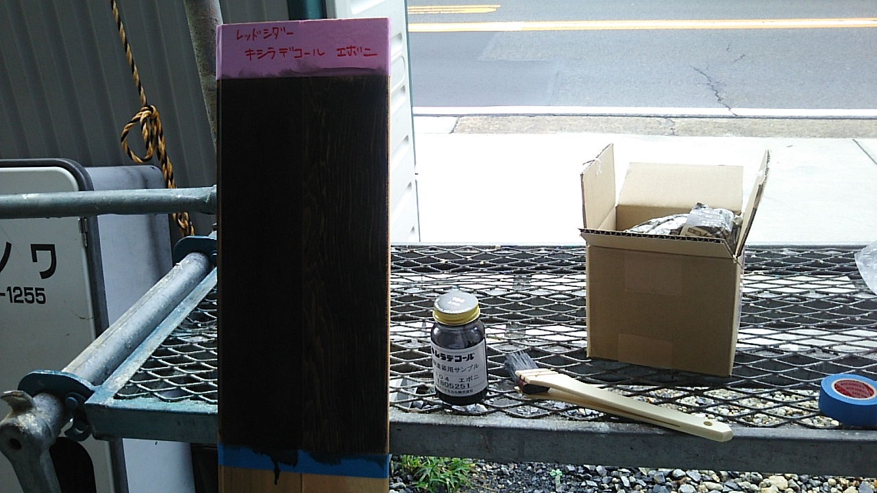 レッドシダーという米杉の羽目板に塗装する濃い色の塗料を試しに塗ってみました。こうしてみると材料そのものの濃淡はともかく、木目の柾目と板目の違いがはっきりと見えてきます。