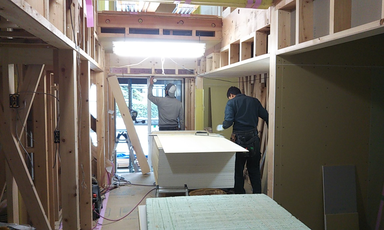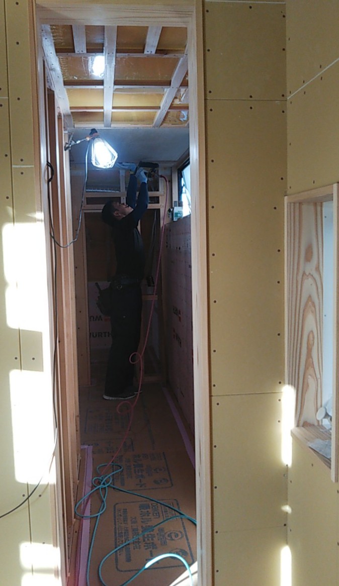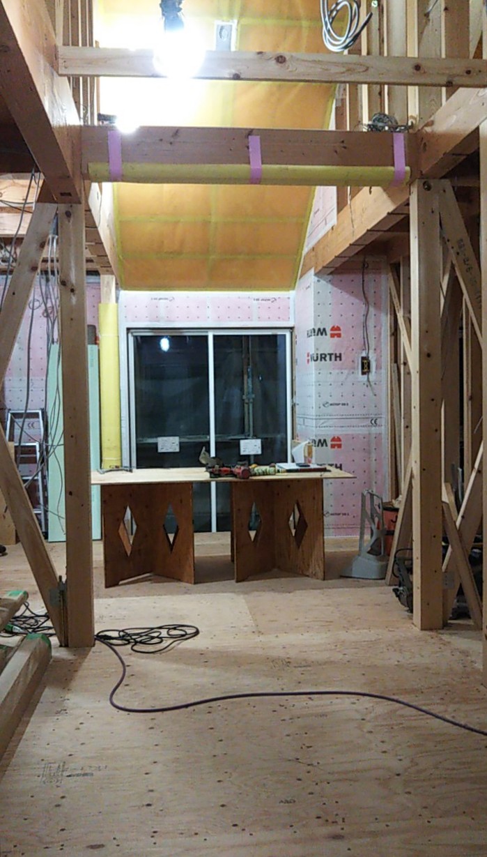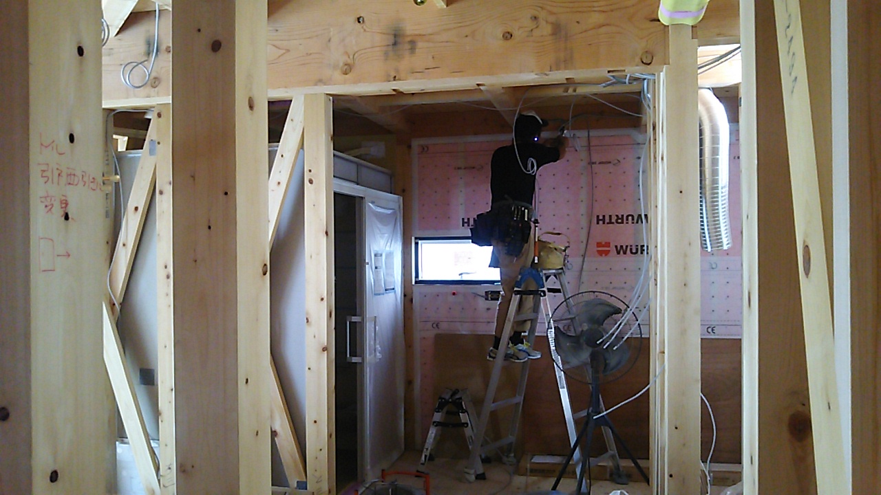 屋内では電気配線や熱交換器のダクト配管工事中。外から聞こえる暴風の音が非常に気になります。
