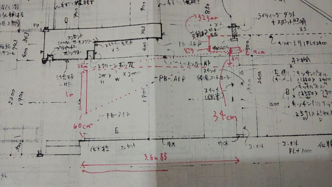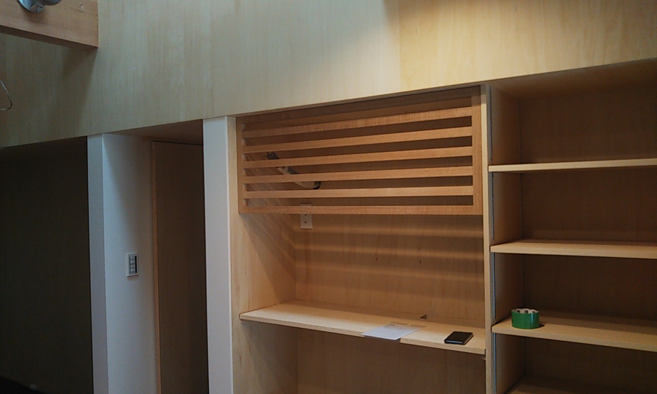オーディオその他取り付ける機器を実際にk様に現場にお持ちいただき、取り付け寸法等を確認しました。百聞は一見にしかず。実物を見てその配線の方法と、木材に対する開口や位置などを確認できました。