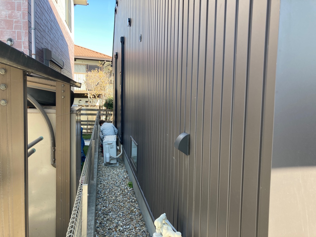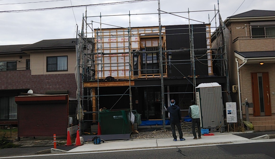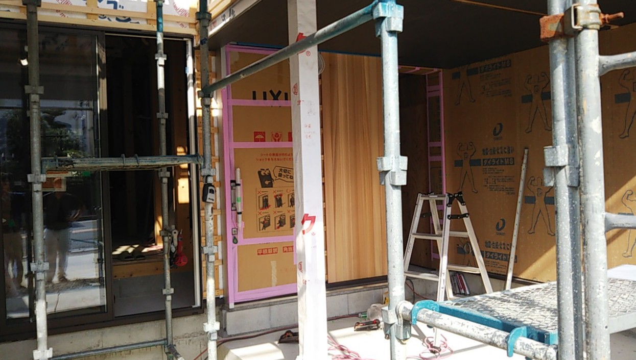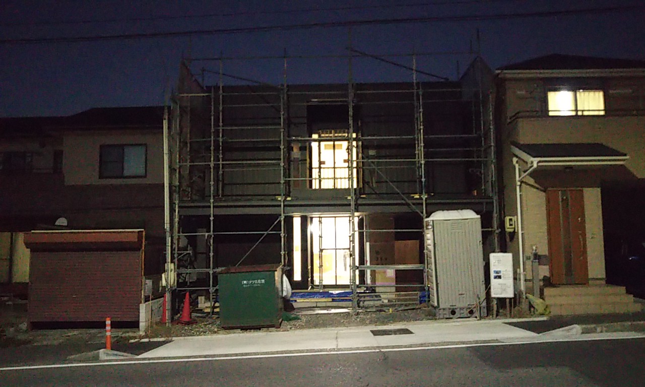 筆者は以前、京都府京都市内で数年間仕事をしていた事があり、そのような現場では隣地との間に足場が立たず非常に難儀した覚えがあります。大げさでなく、隣地との間に手すら入らないケースもありました。(他にも路地の奥にあり、軽車両すら寄り付けない現場、隣の家の中に入らせてもらわないと配線ができない現場など)それに比べたらまだ足場がかかるだけありがたく、私の中では狭い内には入らない現場です。