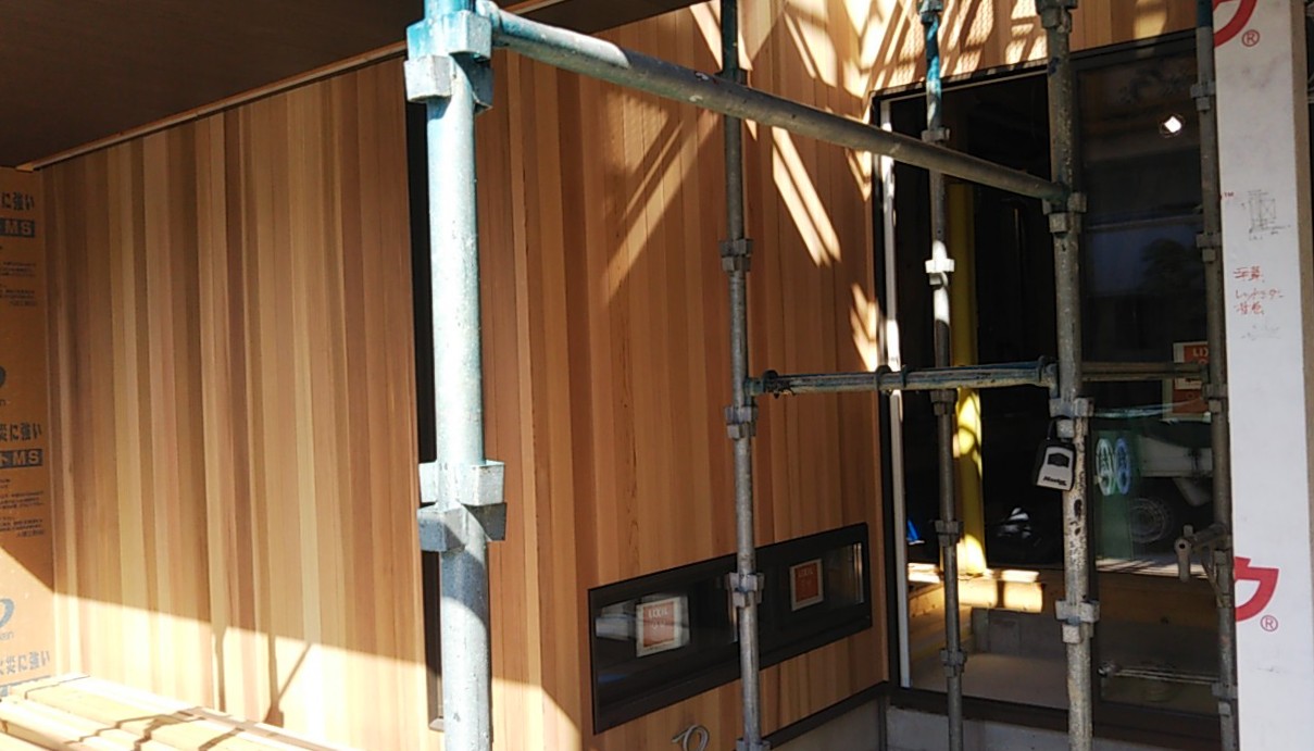 外壁木板張の部分が張り終わりました。このままでもキレイに見えますが、ここはこの後濃いカラーの塗装を行います。