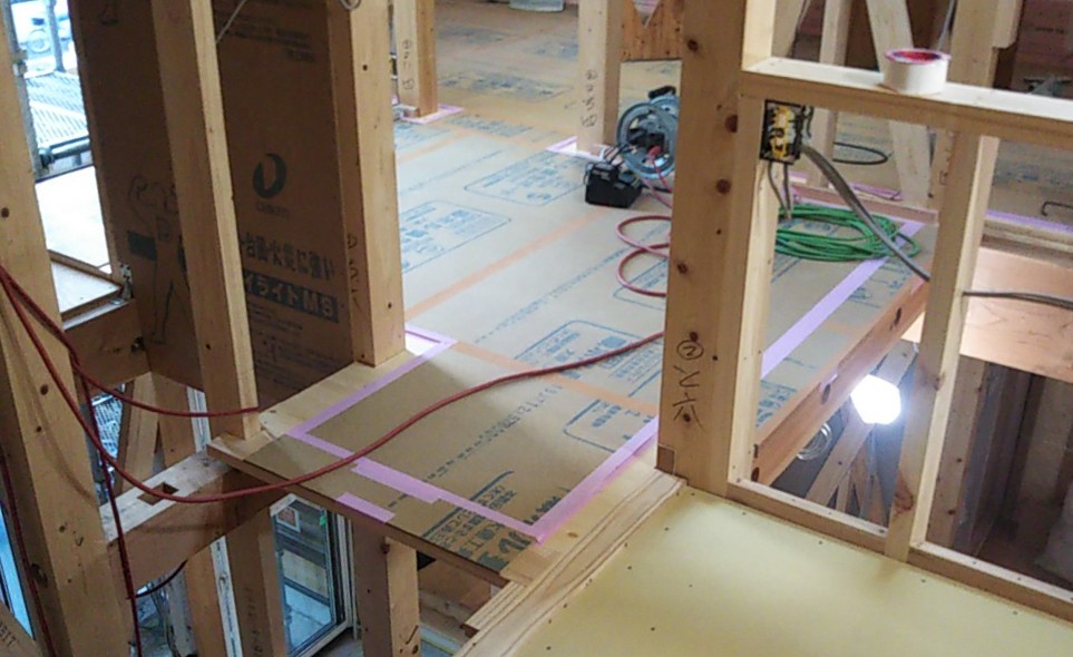 2階の床には消音の効果を求めてフローリングを敷く前にプラスターボードを敷きます。