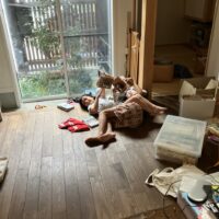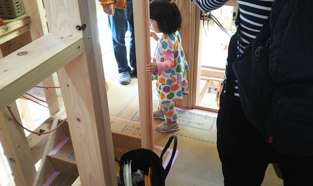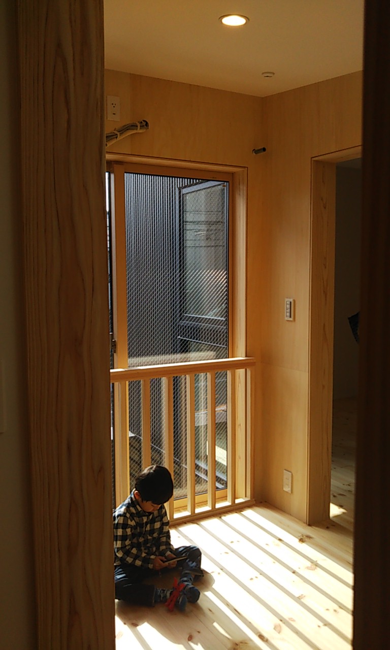 k様のご友人の方が『完成直前の住宅を見てみたい!』という事でご来場されました。いらっしゃいませ。 個性的な内部空間に興味津々。お子さんが日差しの中で気持ちよさそうに座っている空間の名称は『サンルーム』、まさにその名にいつわりなし!