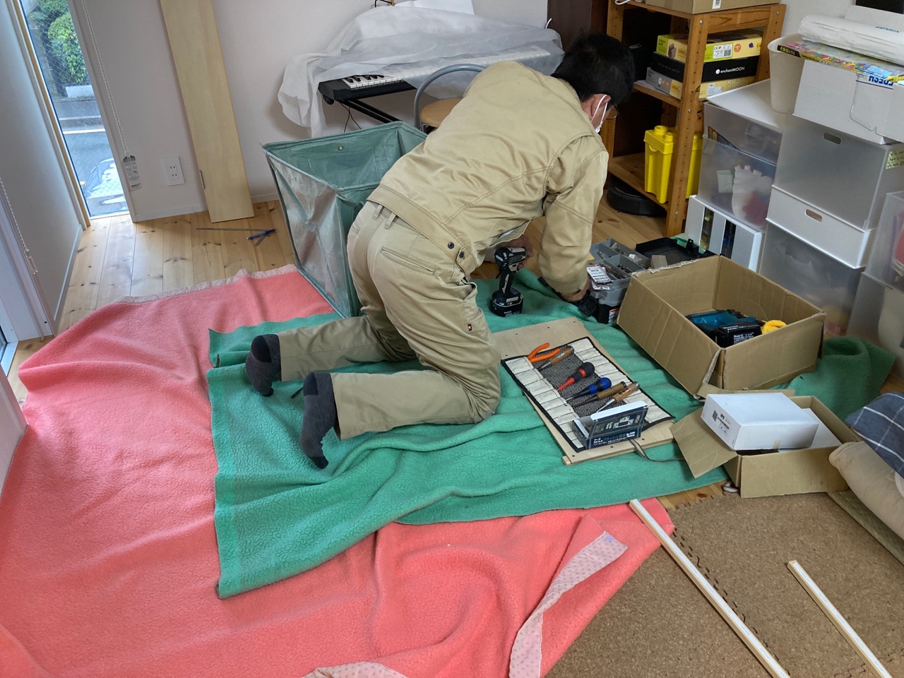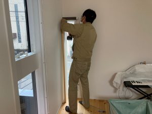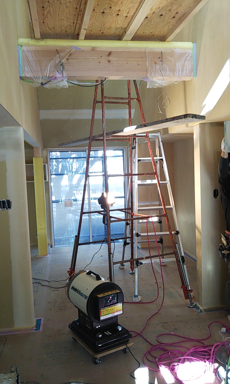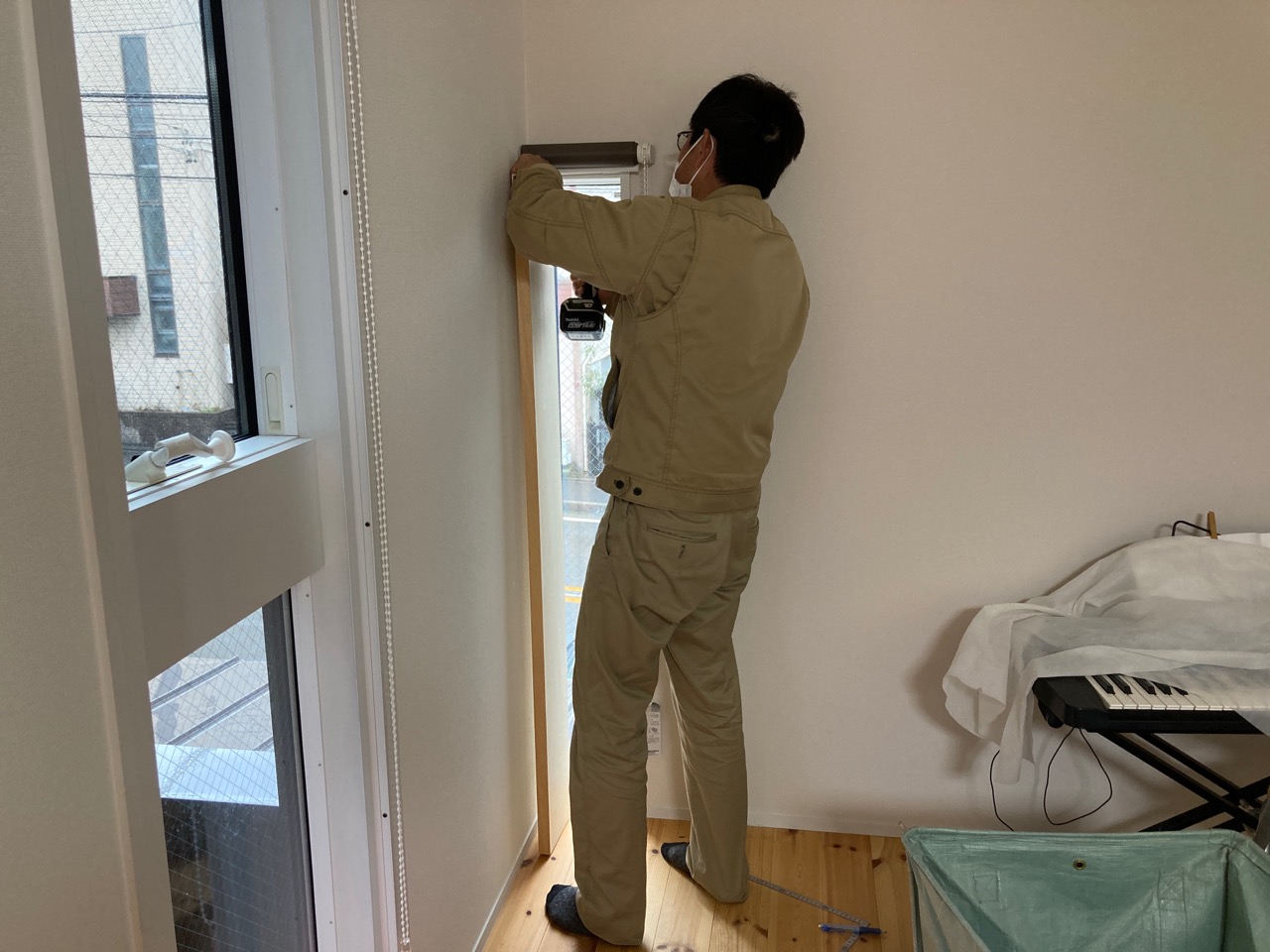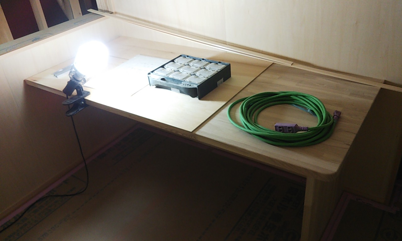 まだまだ細かい物干金物などを取り付ける作業が残っています。それらをいろいろ取り付け作業するうち、外部は寒いのかもしれませんが、内部では先ほどのヒーターを2台焚いているので暑いのなんの。