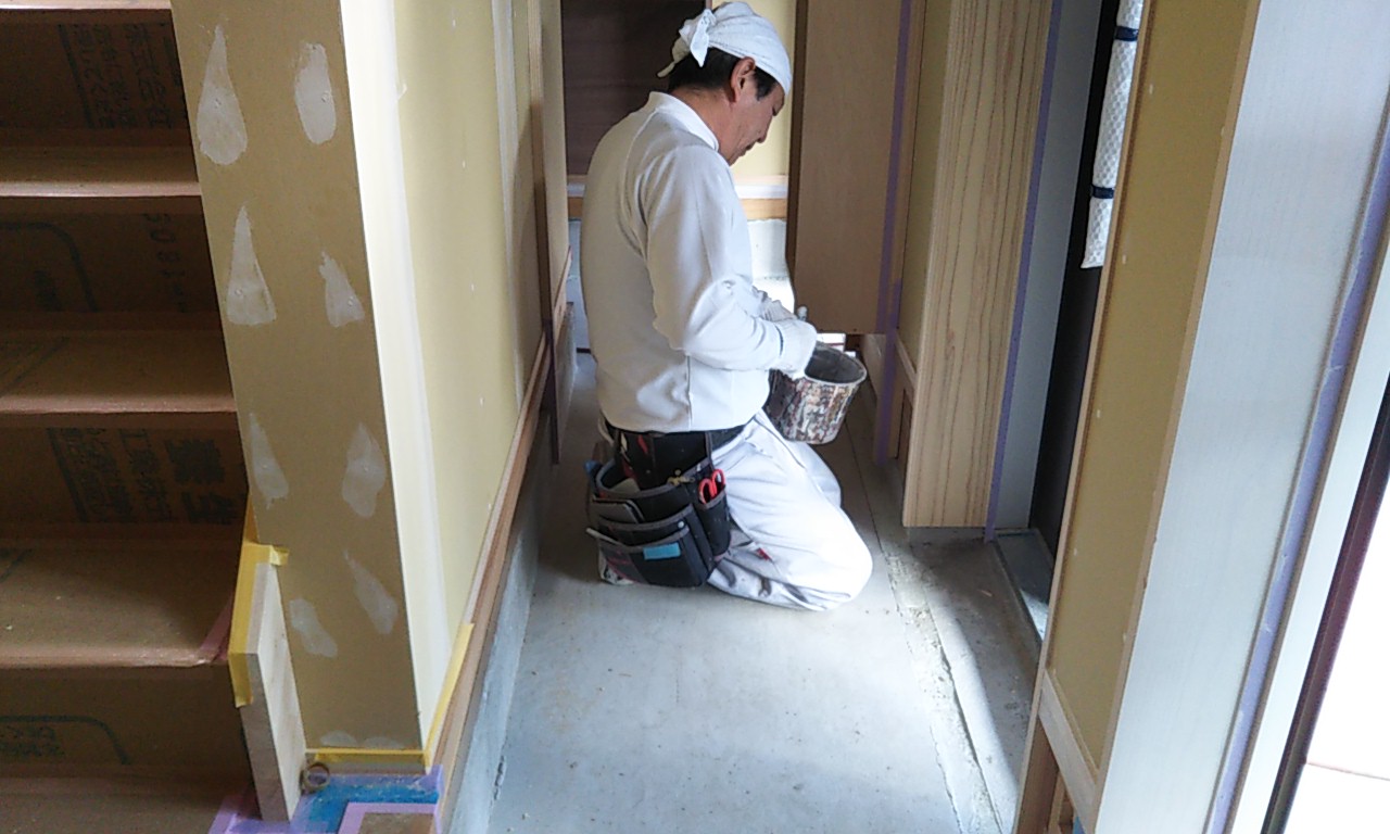 下地工事中。現場内のスペースが限られていますので、効率的な作業が必要です。