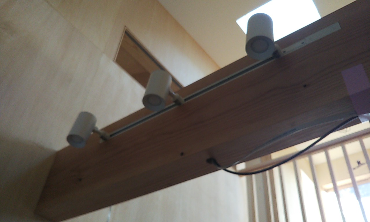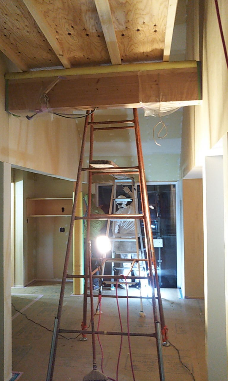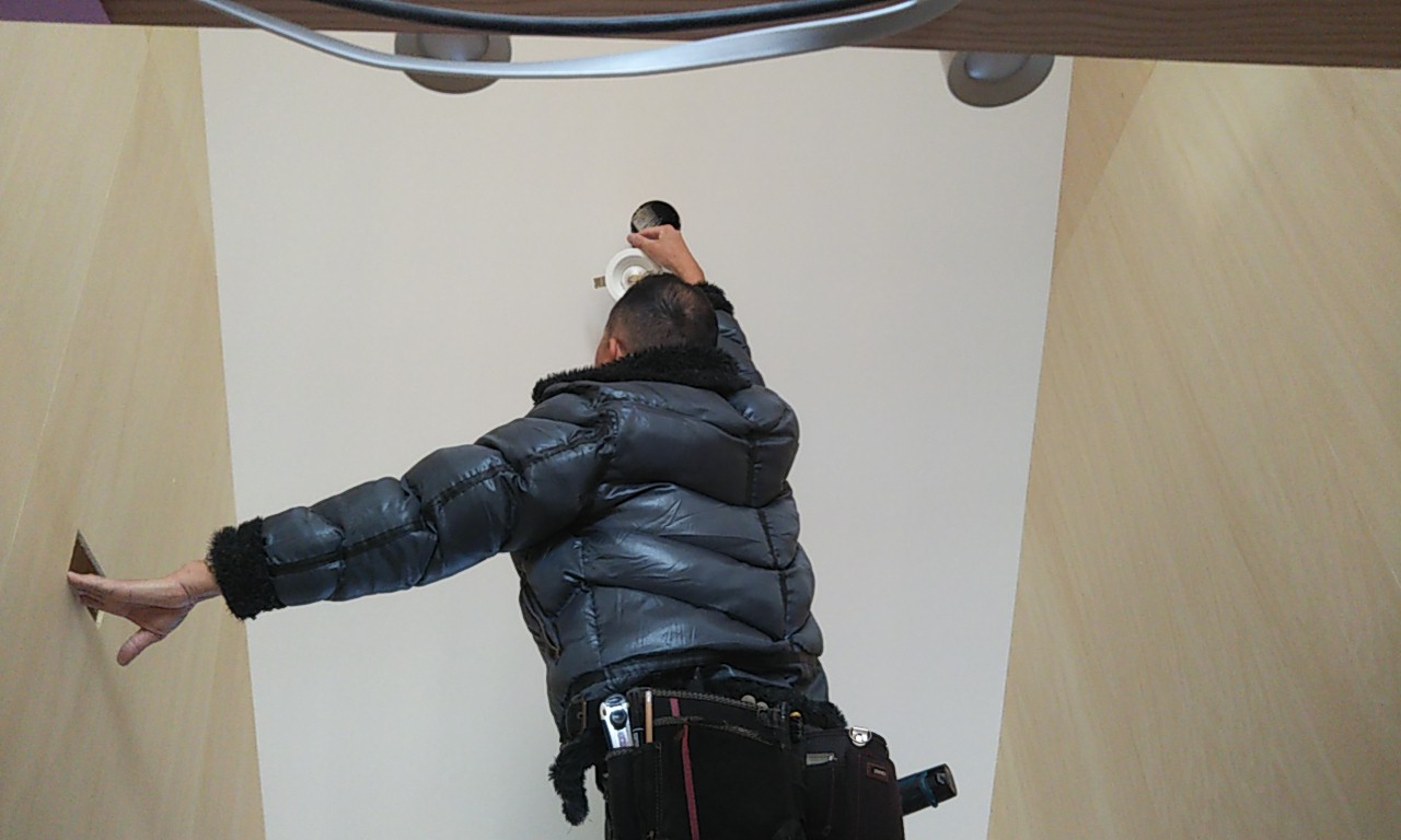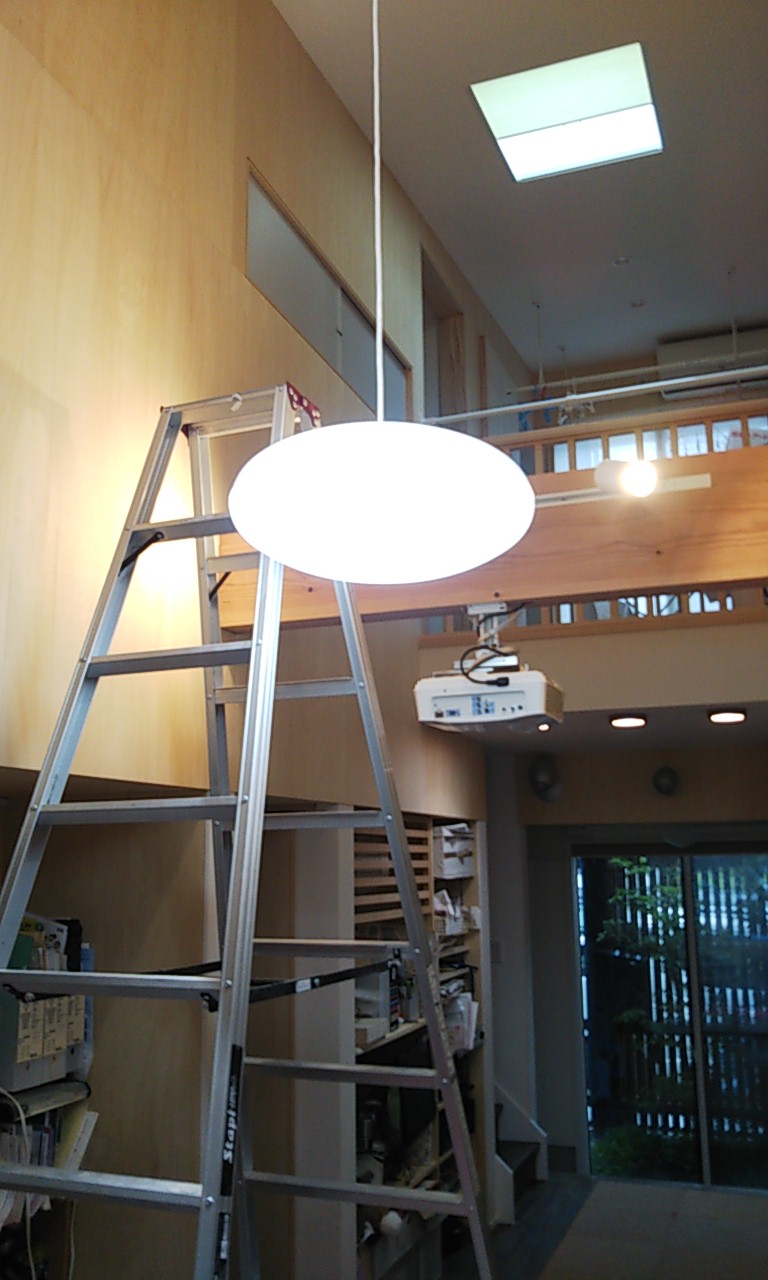 ダイニングにはペンダントライトが追加でご希望のため、新たに配線をし、取付けました。勾配天井の高い部分に配線をする必要があるため普段はあまり使用しない長脚立を現場に搬入しています。