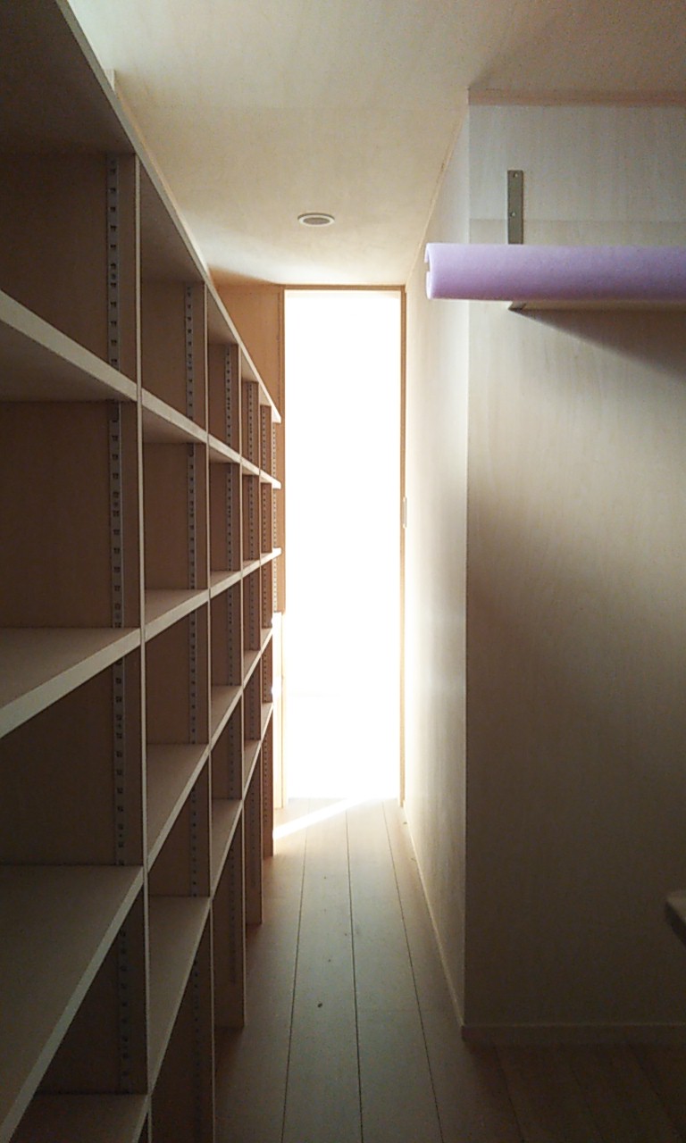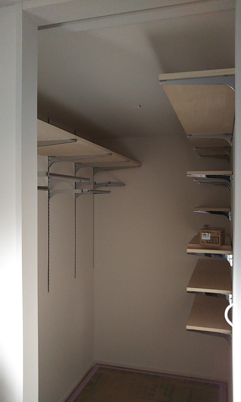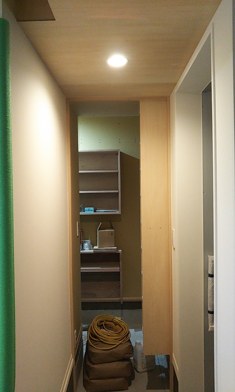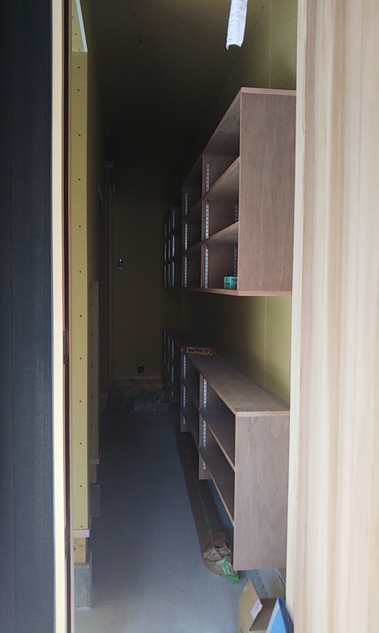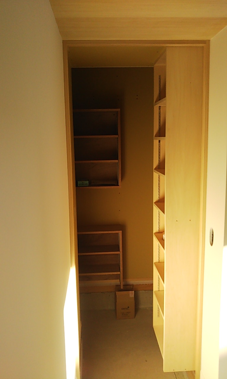 可動棚の板を追加したり、固定棚の位置を少し移動したりする作業です。設計段階、施工段階で『これで良し』と思った配置、寸法でも実際に生活してみると『棚があと一枚欲しい』『もう10cm移動したい』など詳細な希望が新たに生まれます。『イエは三軒建ててやっと満足のいくものができる』とはよく言ったものです。