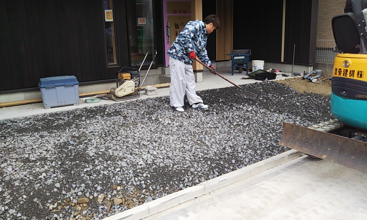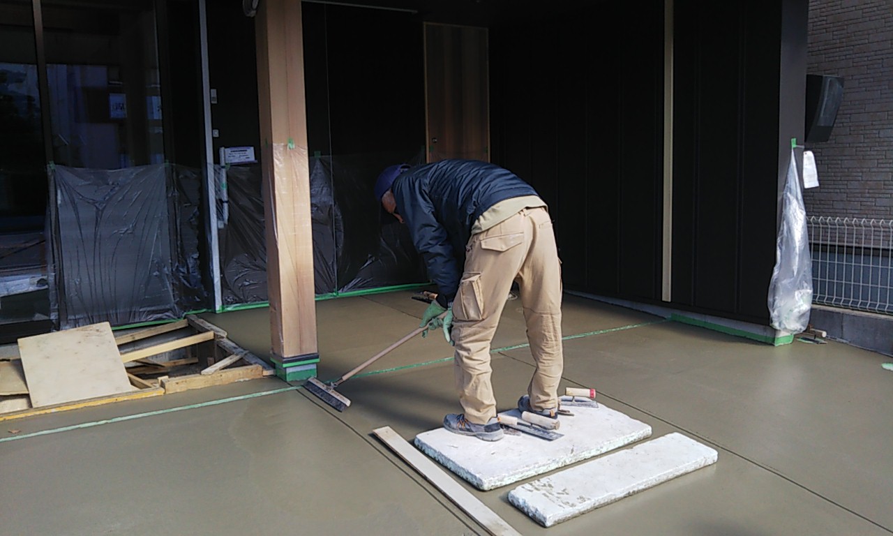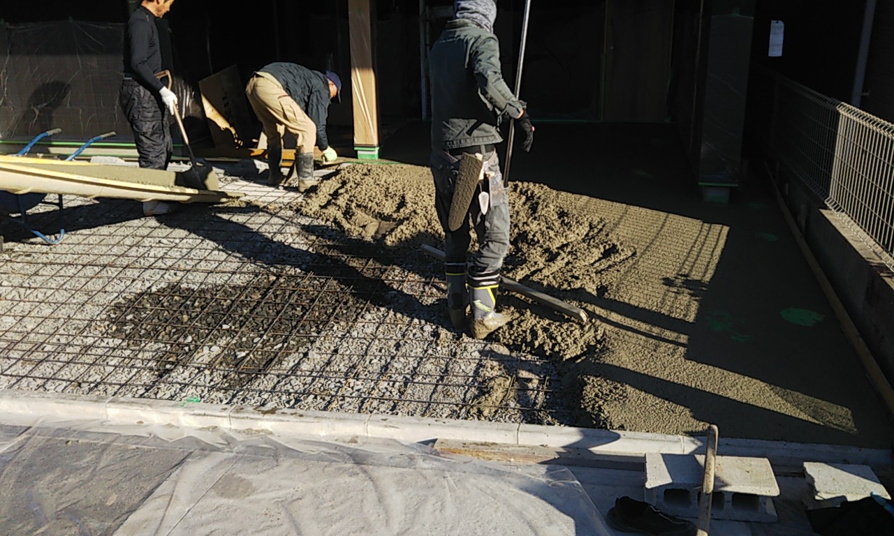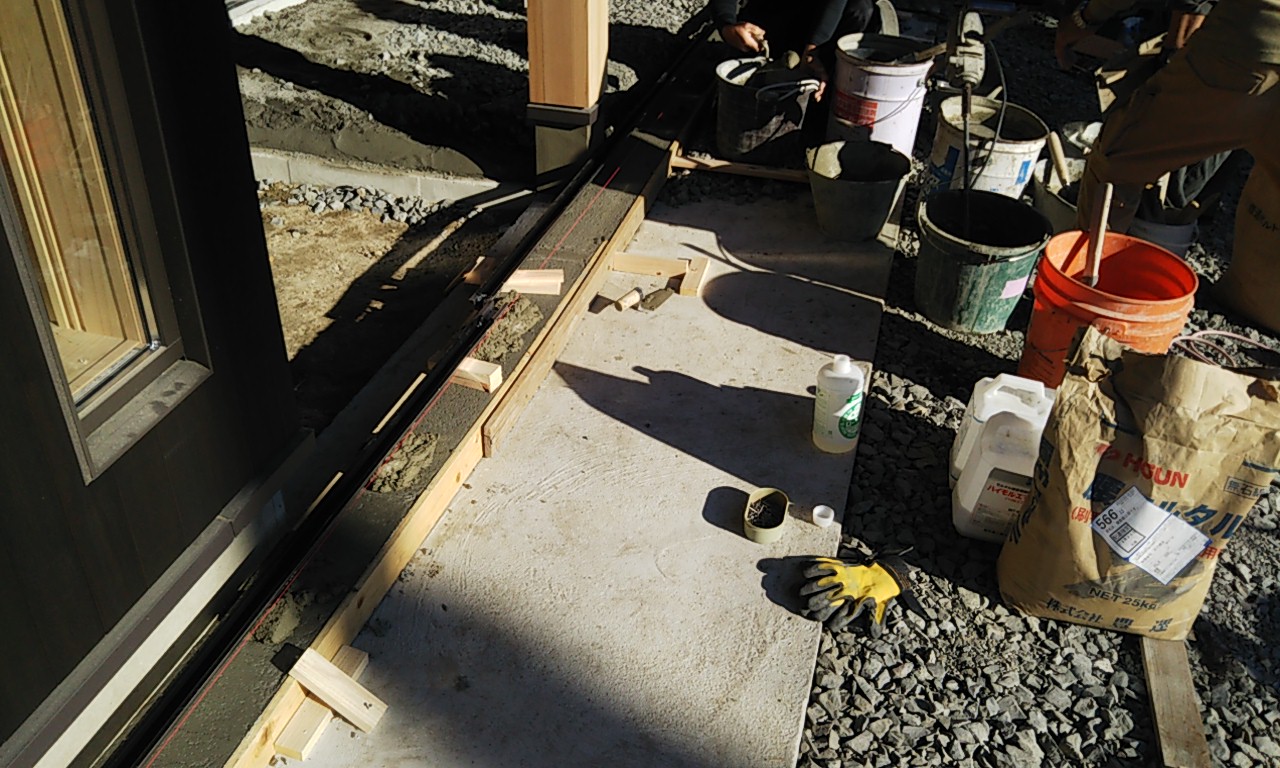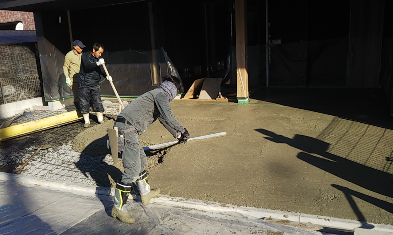 外部駐車場のコンクリート打設。今日は風が冷たいものの日射しが陰る事無く、コンクリートの仕事をするには最適の状況です。冬季という事もあり、コンクリートには早強剤を混和しています。