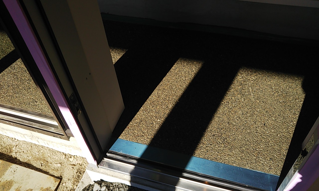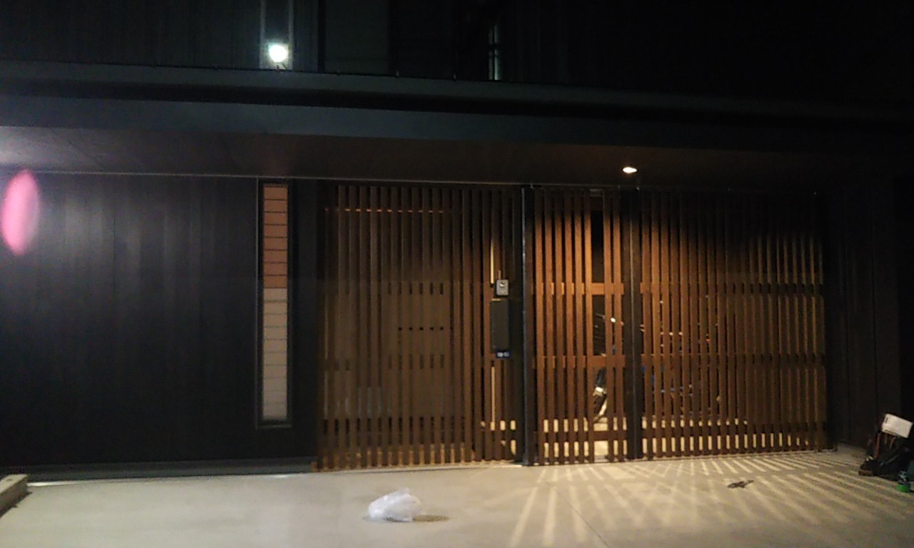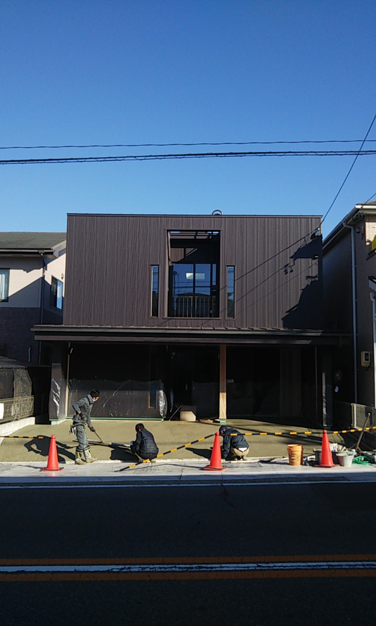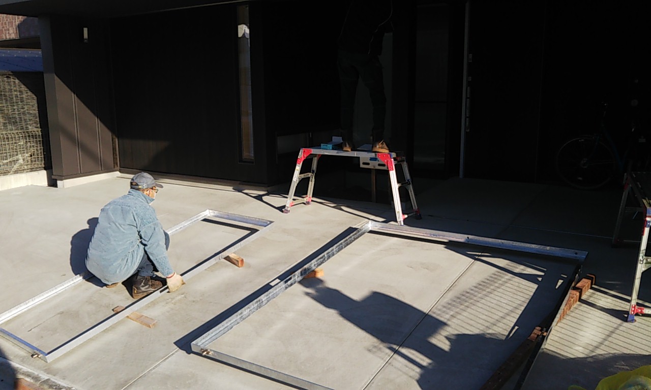 アプローチ部分に取り付けるゲート引き戸の枠を鉄骨で作成し、鉄工屋さんに取り付けてもらいました。鉄骨を溶接で組んで、亜鉛メッキ加工(通称『ドブ漬け』)を施したものです。普段木造住宅で木材ばかり扱っていますと、いざという時に鉄材を使った仕様は未知の事が多く、四苦八苦しましたが、何とか取り付けまでは完了しました。木材と違い、なかなか精密に作成する事が難しいものです。