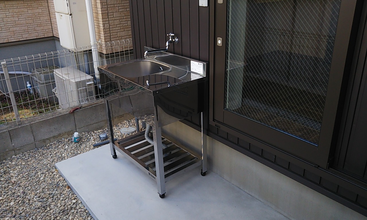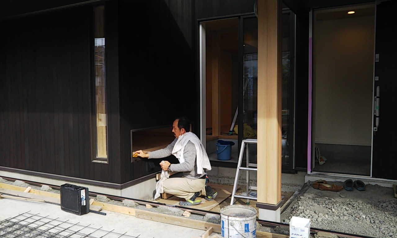 外回りの各設備取付。勝手口付近には外部で使用したものなどを洗うためのステンレスシンクを備え付け。玄関脇の袖壁のさらに外側には宅配業者御用達の宅配ボックスが据え付けられました。不在による配送との行き違いもなく、荷物を受け取れるものとして、特に最近の分譲住宅などでよく目にするようになってきました。宅配業者さんとしてもこの箱があると助かるようです。