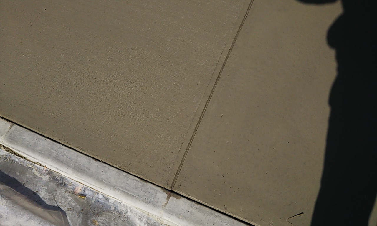 玄関から道路へ一直線に伸びる動線上の部分のみ、刷毛引き仕上を施します。コンクリートが固まる前に刷毛で均すことによって表面を少し粗しておき、滑りにくくします。写真ではわかりづらいですが、目地を境に左が刷毛引き、右がコテ仕上です。