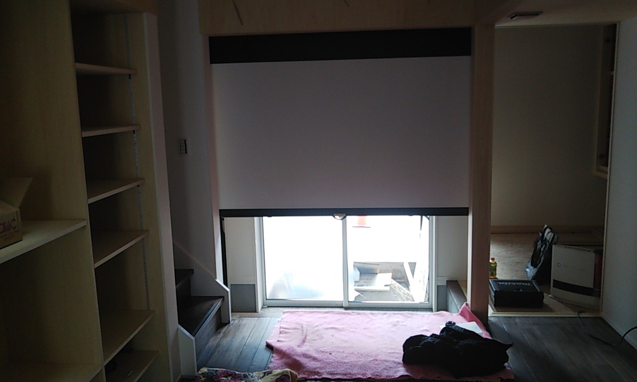 玄関先にある天井のボックスに手動スクリーンを取り付けました。室内のプロジェクタから映像を映写して映画などを楽しむことができるそうです。