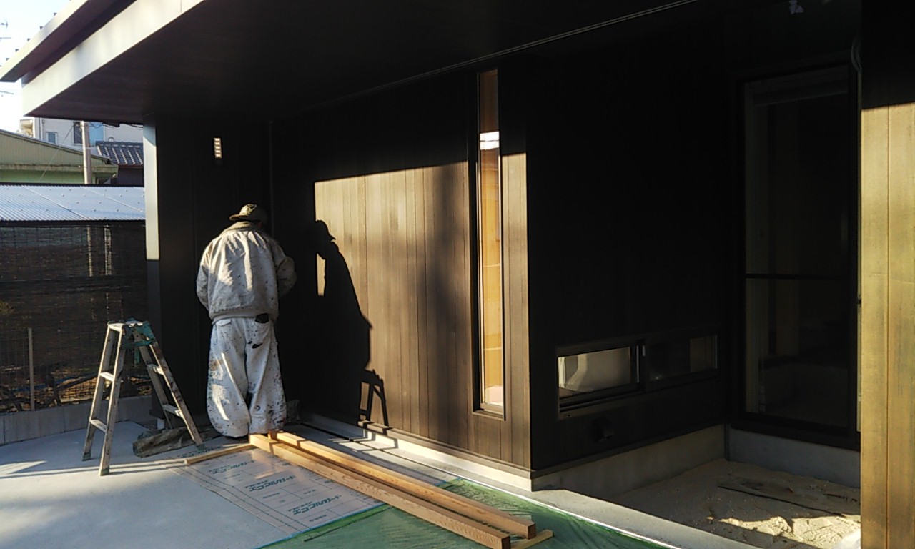 外壁面の造作仕事、1階の南面、アプローチや中庭に面した部分には米杉の羽目板を張っていきます。後々塗装して外壁や軒天と同じようなカラーリングにする予定です。